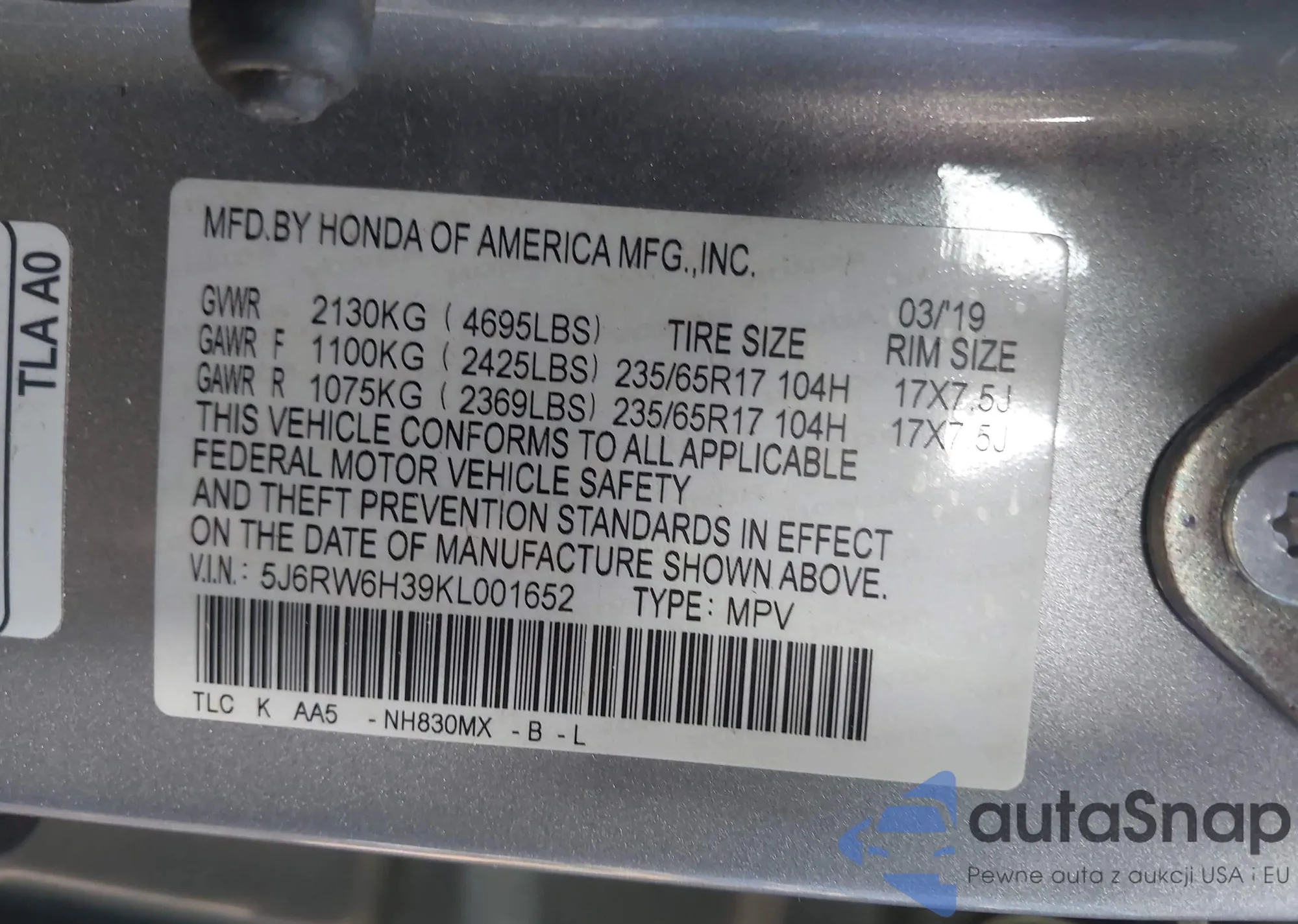 Автомобиль Honda CR-V 2019 (VIN 5J6RW6H39KL001652) ранее не участвовал в торгах. Документы чистые, пробег соответствует или ниже среднего по рынку. Продаётся страховой компанией — рекомендуем покупку. Доставка в порт займет около 6–8 недель.
