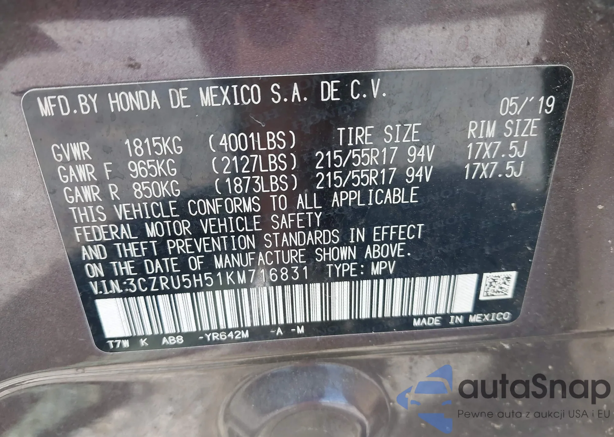 VIN: 3CZRU5H51KM716831
