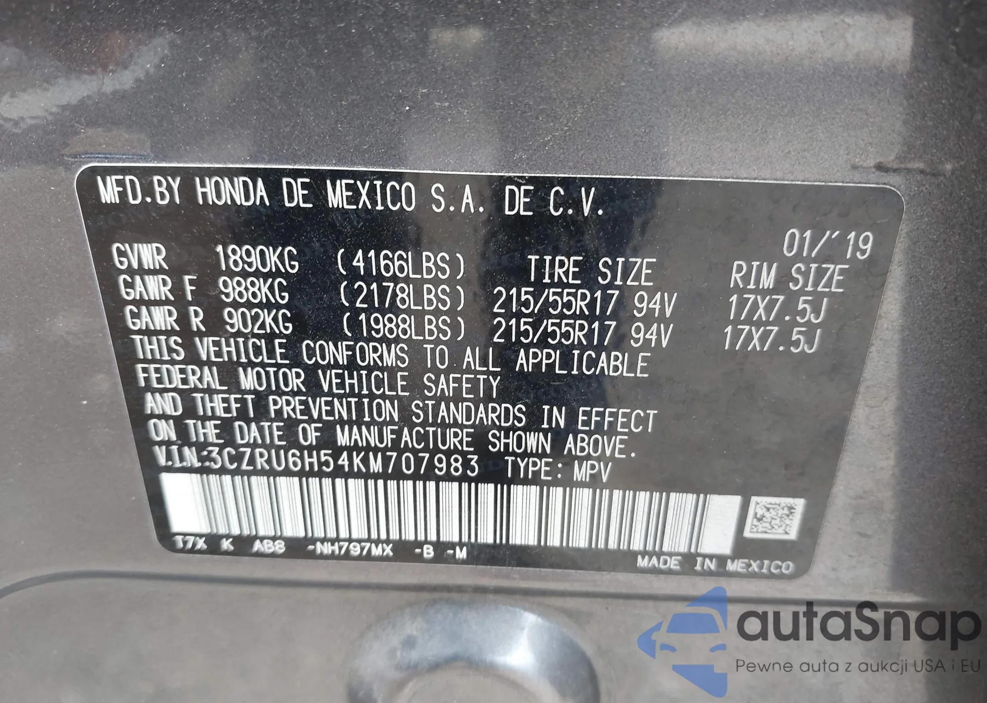 VIN: 3CZRU6H54KM707983