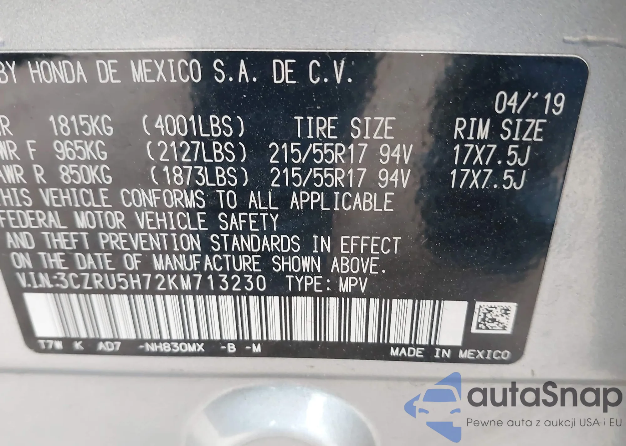 • VIN: 3CZRU5H72KM713230