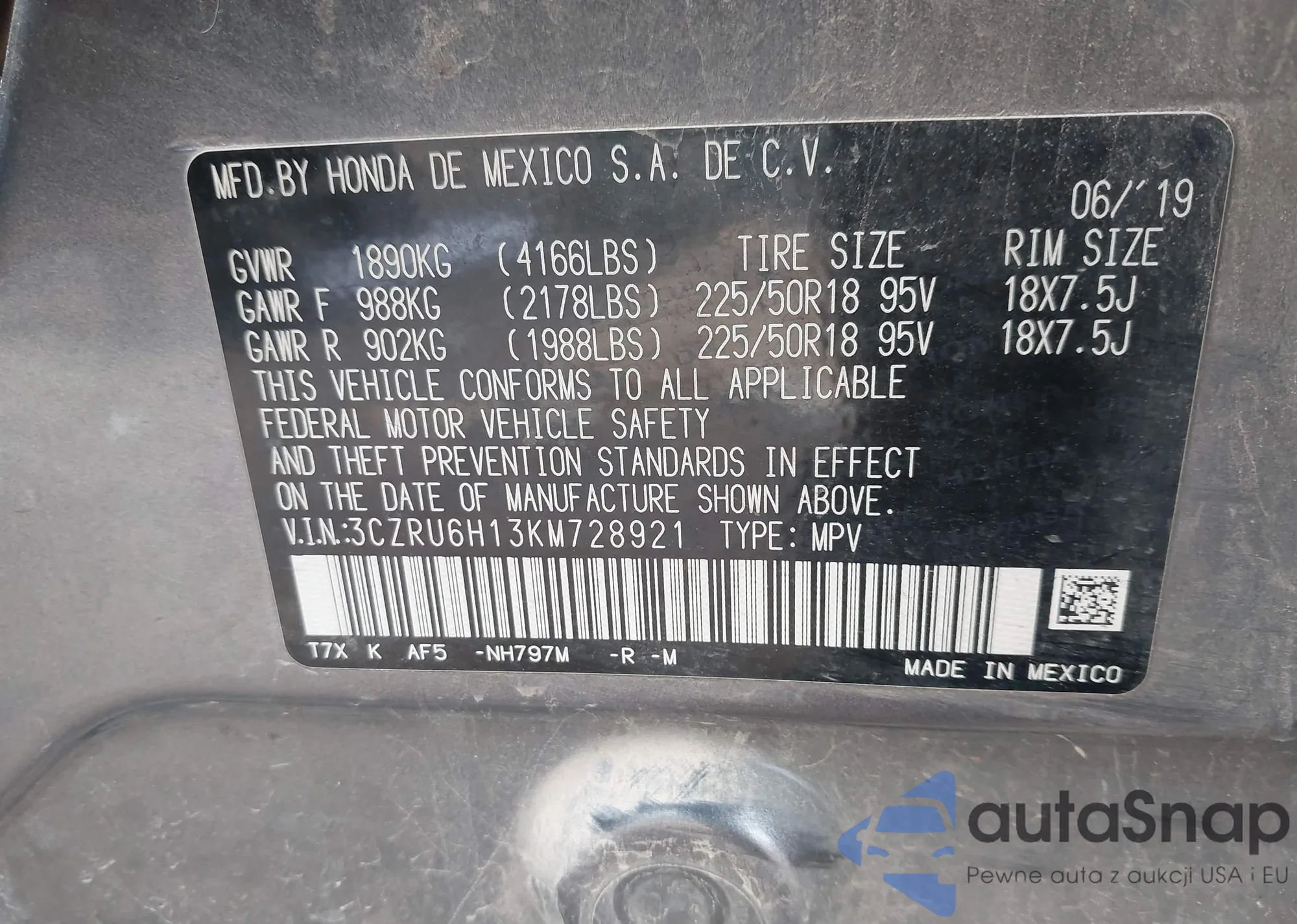 Автомобиль Honda HR-V 2019 (VIN 3CZRU6H13KM728921) ранее не участвовал в торгах. Документы чистые, пробег соответствует или ниже среднего по рынку. Продаётся страховой компанией — рекомендуем покупку. Доставка в порт займет около 6–8 недель.