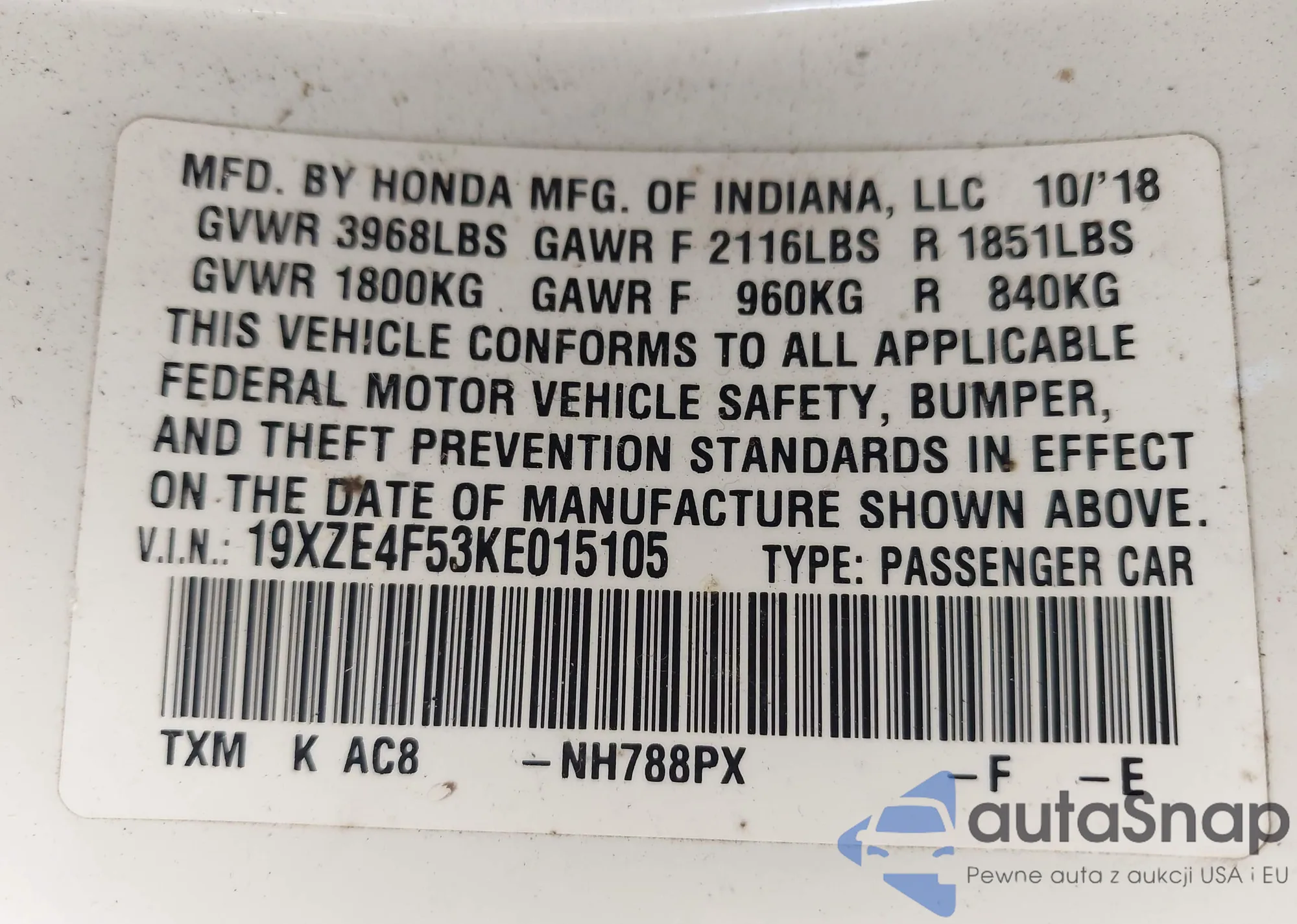 VIN: 19XZE4F53KE015105