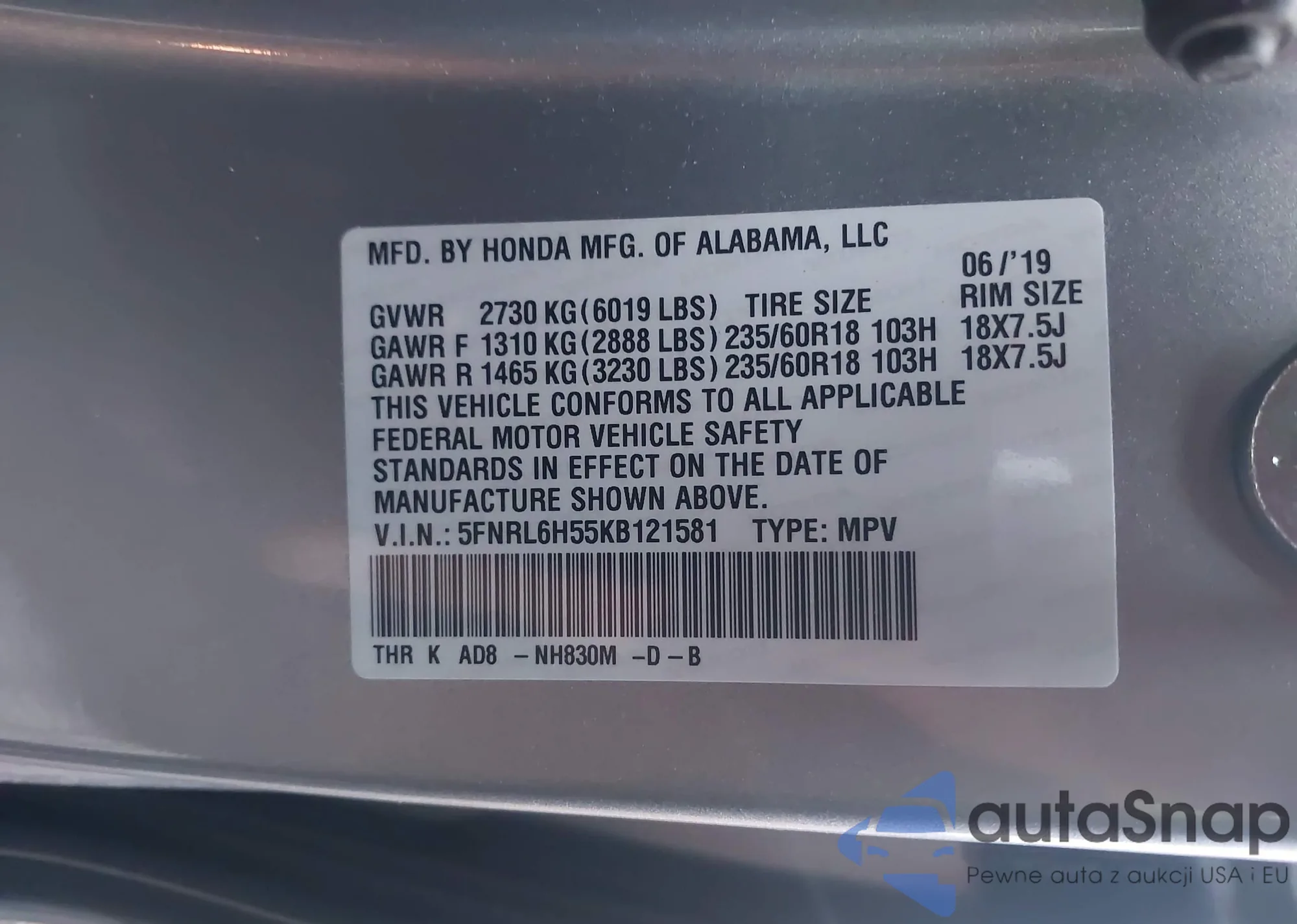 VIN: 5FNRL6H55KB121581