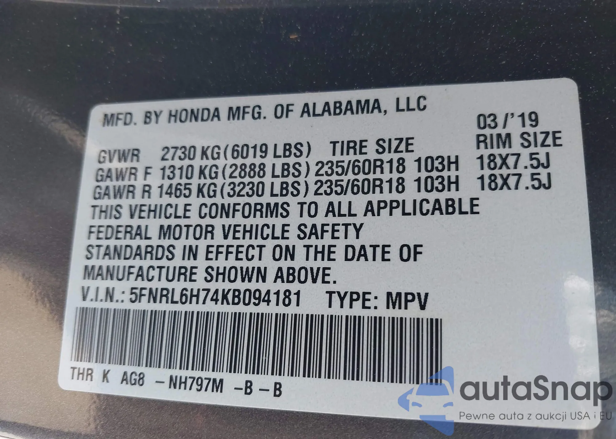 VIN: 5FNRL6H74KB094181
