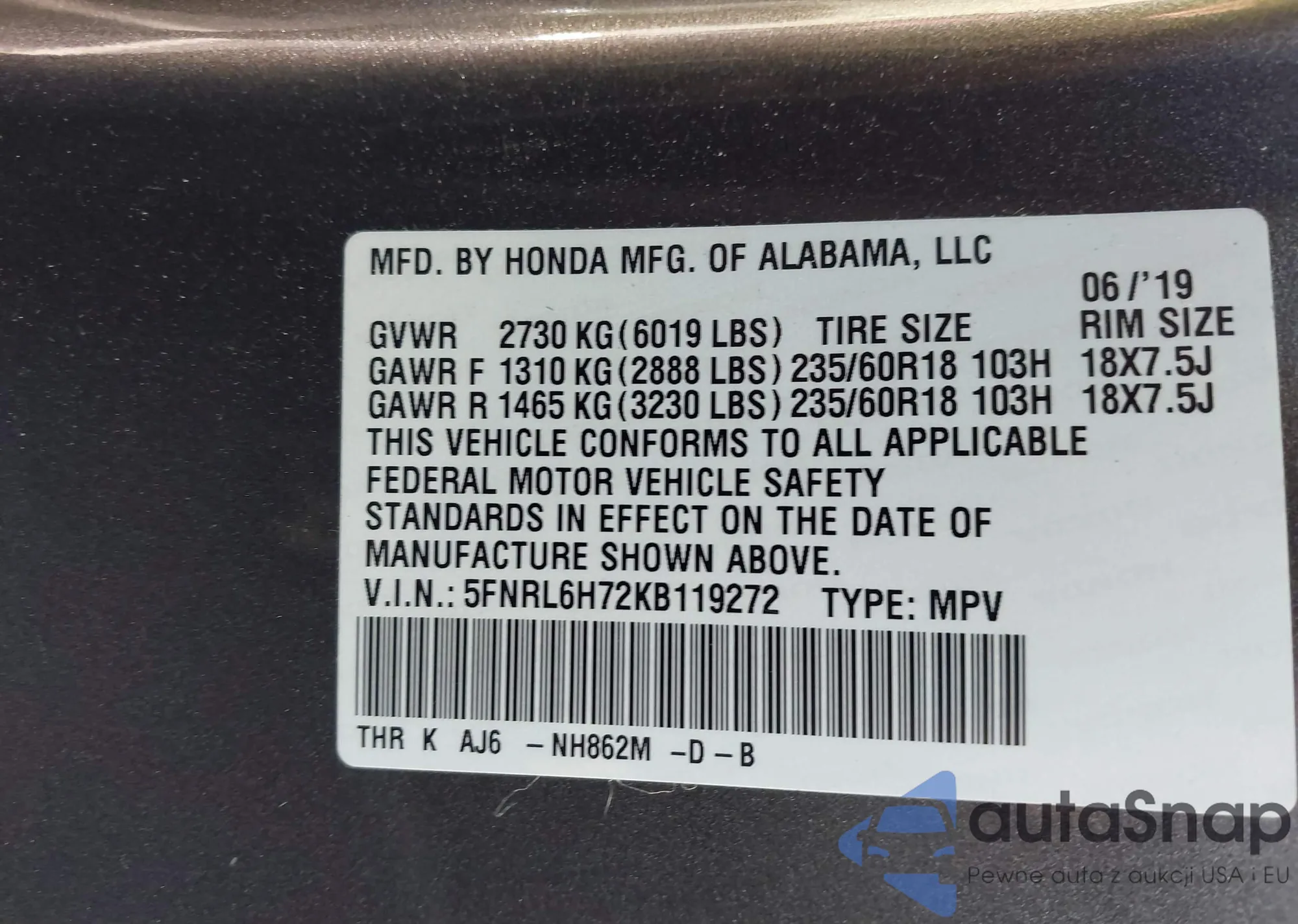 VIN: 5FNRL6H72KB119272