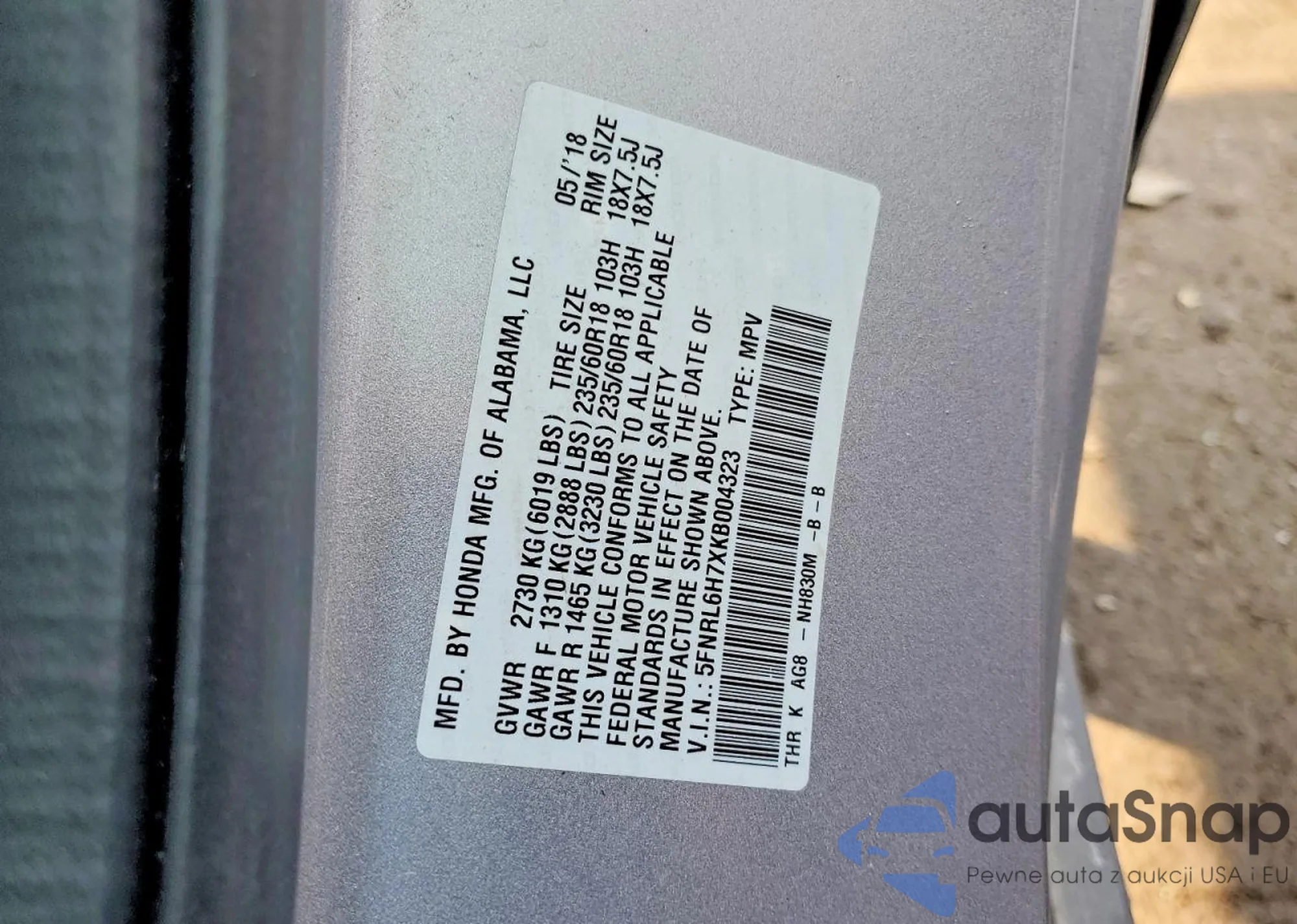 VIN: 5FNRL6H7XKB004323