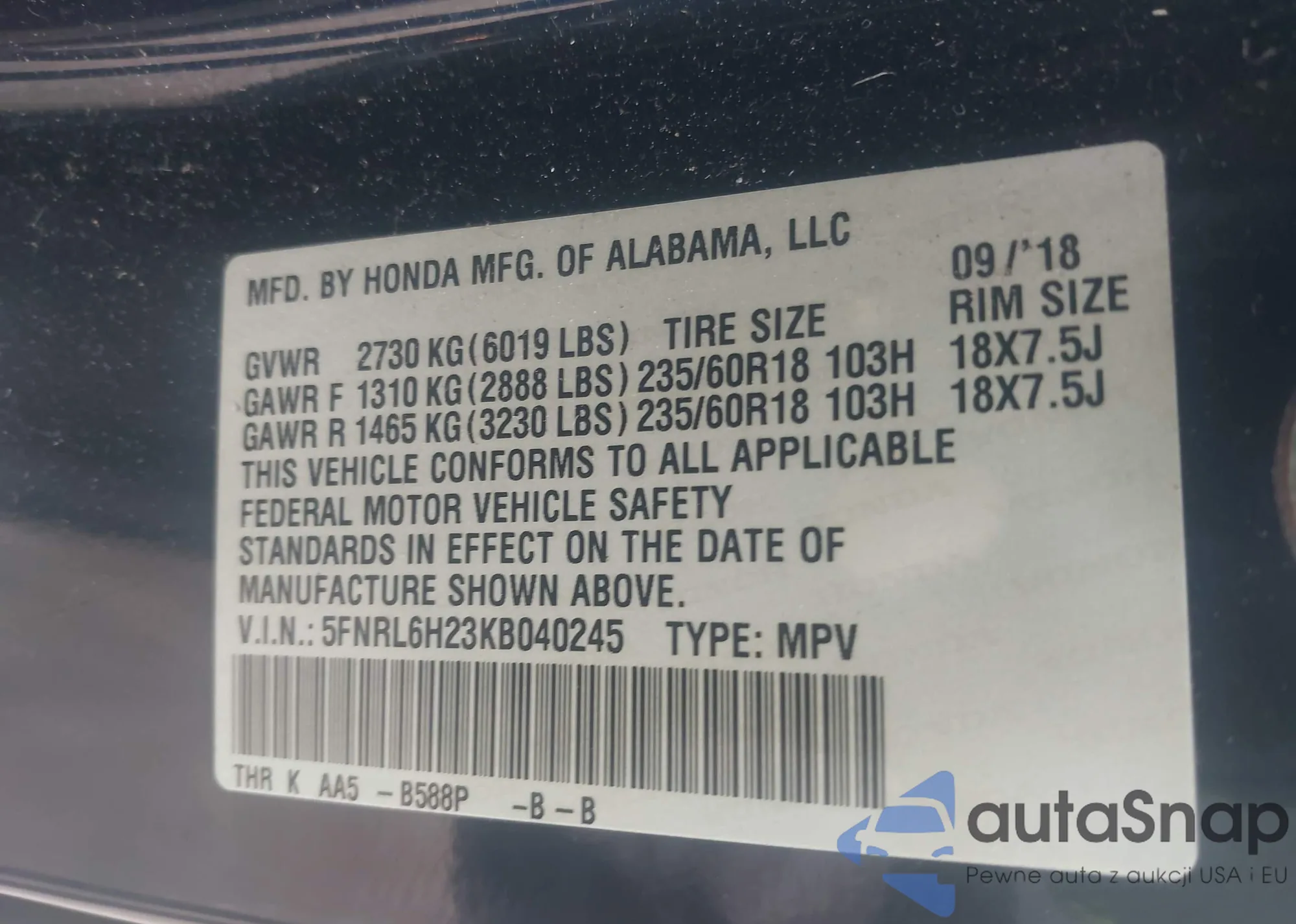VIN: 5FNRL6H23KB040245