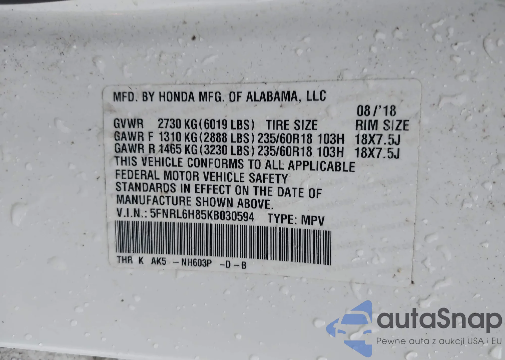 VIN: 5FNRL6H85KB030594