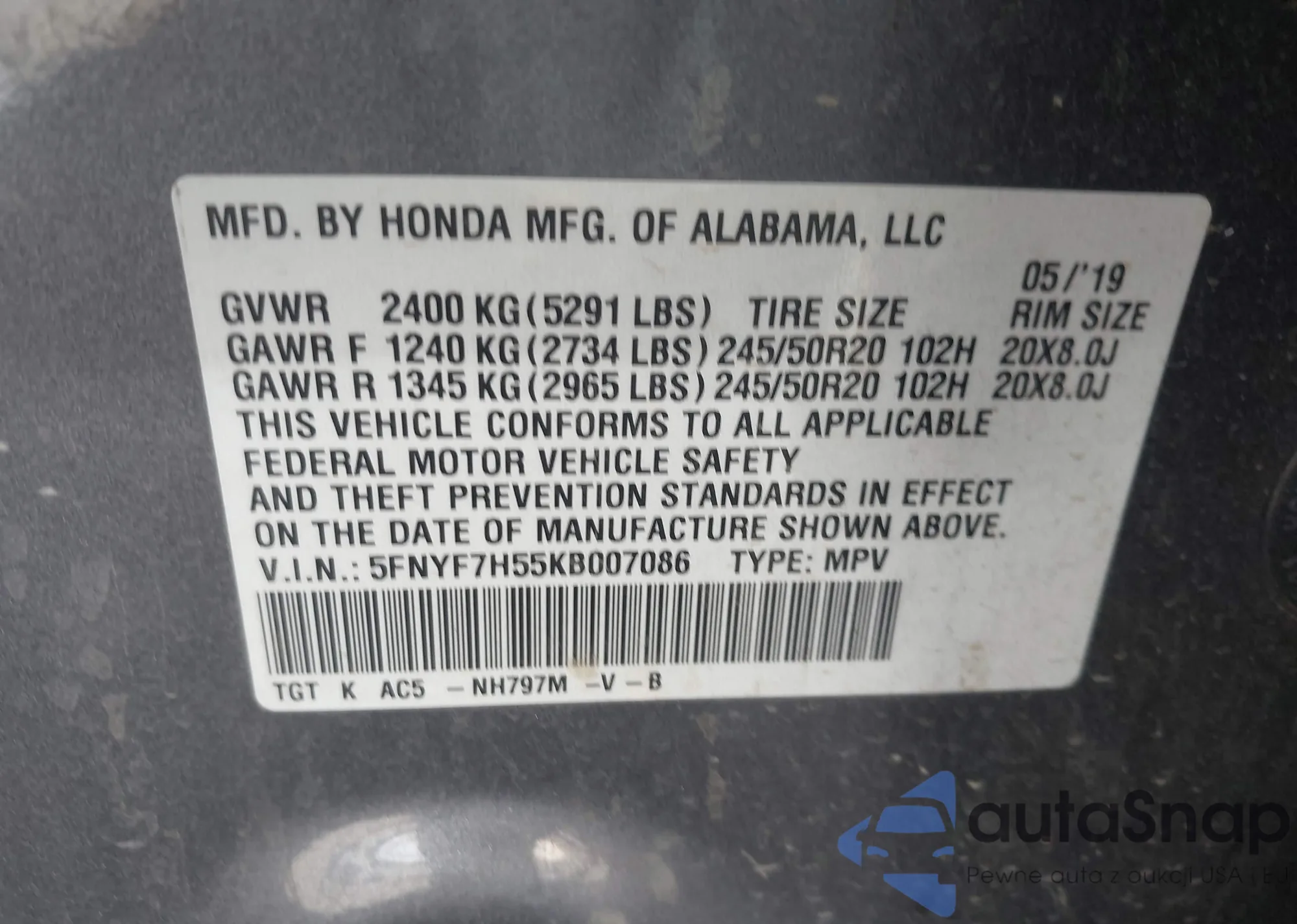VIN: 5FNYF7H55KB007086