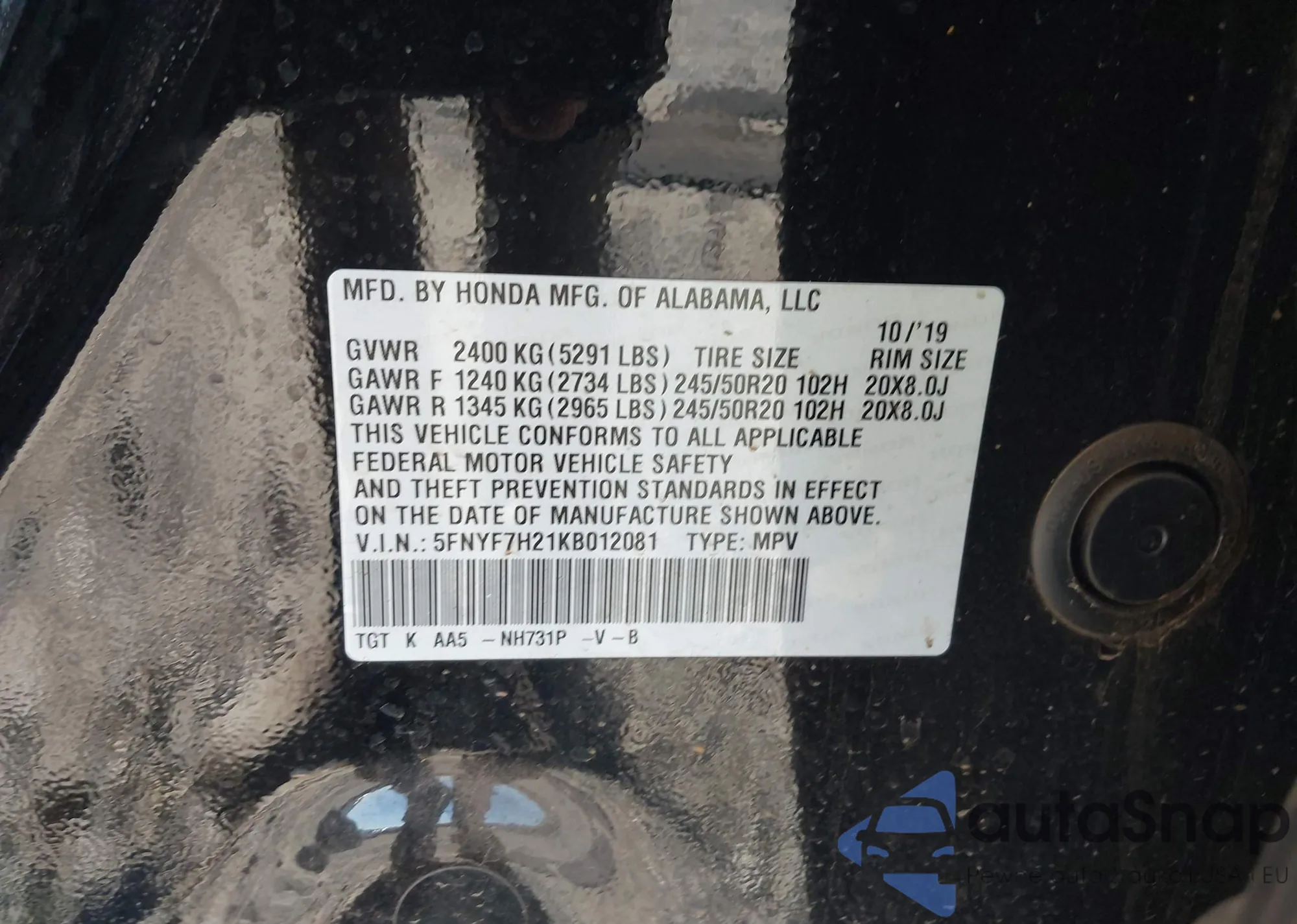 VIN: 5FNYF7H21KB012081