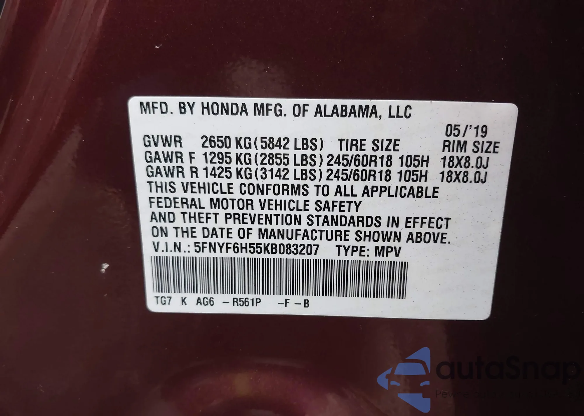 • VIN: 5FNYF6H55KB083207