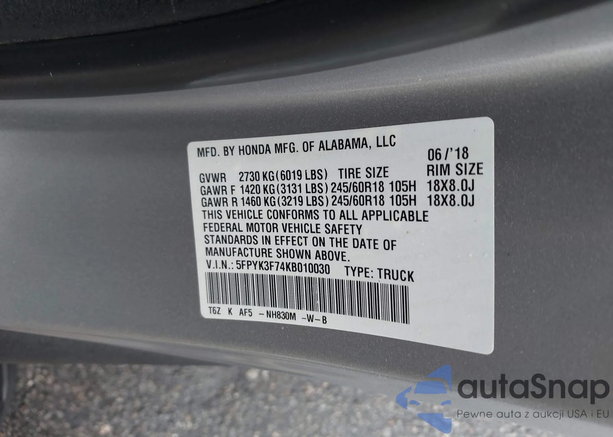 VIN: 5FPYK3F74KB010030