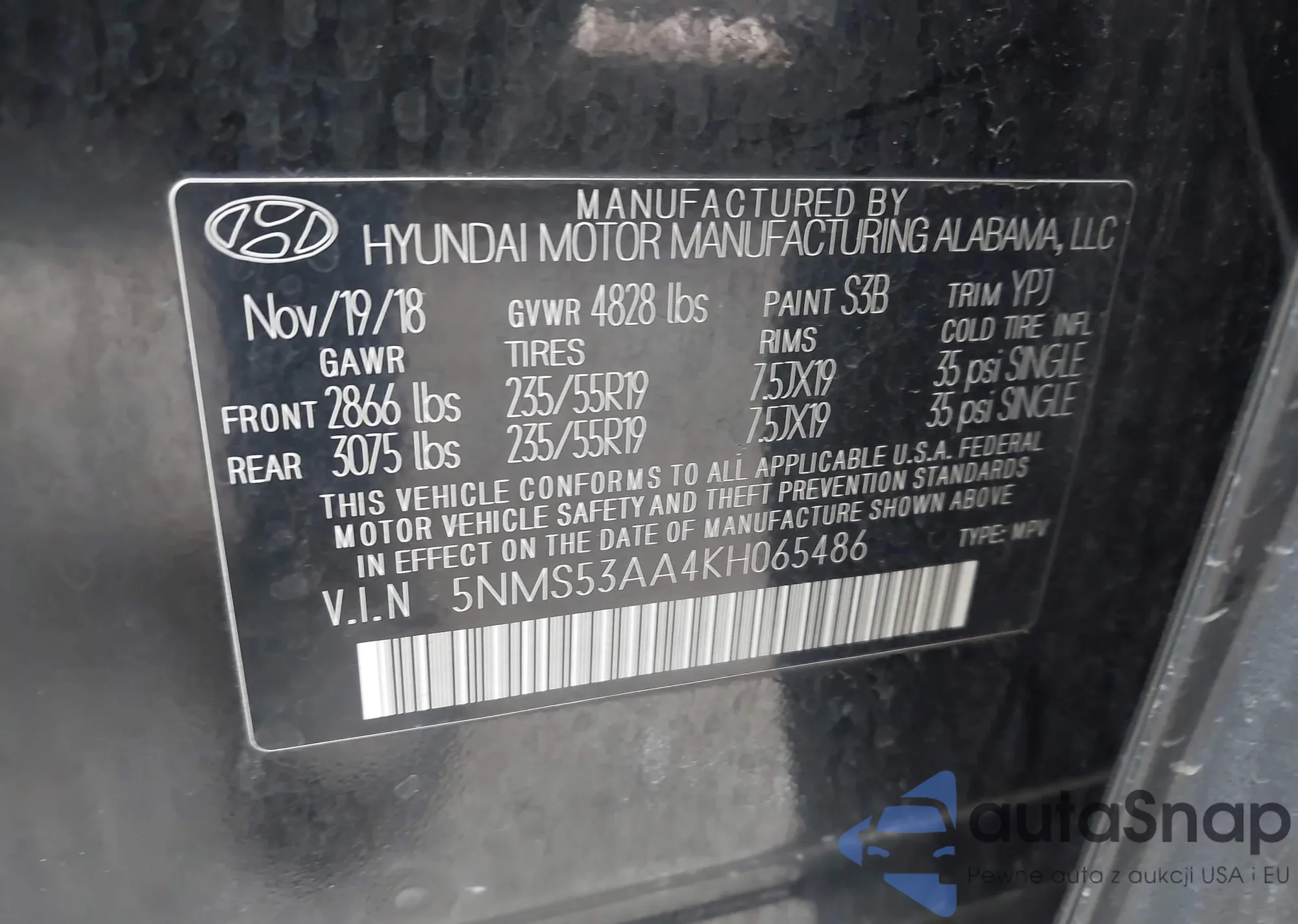 Автомобиль Hyundai Santa Fe 2019 (VIN 5NMS53AA4KH065486) ранее не участвовал в торгах. Документы чистые, пробег соответствует или ниже среднего по рынку. Продаётся страховой компанией — рекомендуем покупку. Доставка в порт займет около 6–8 недель.