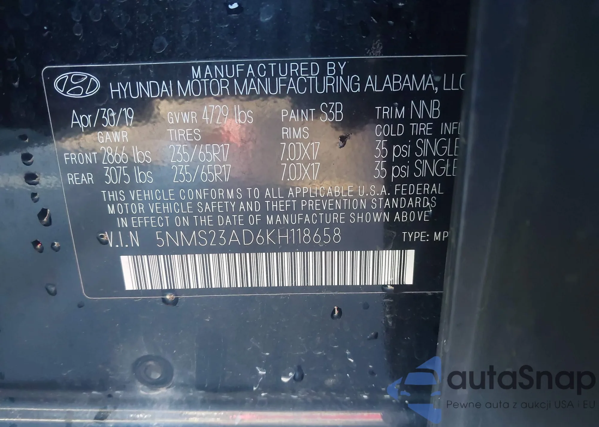 VIN: 5NMS23AD6KH118658