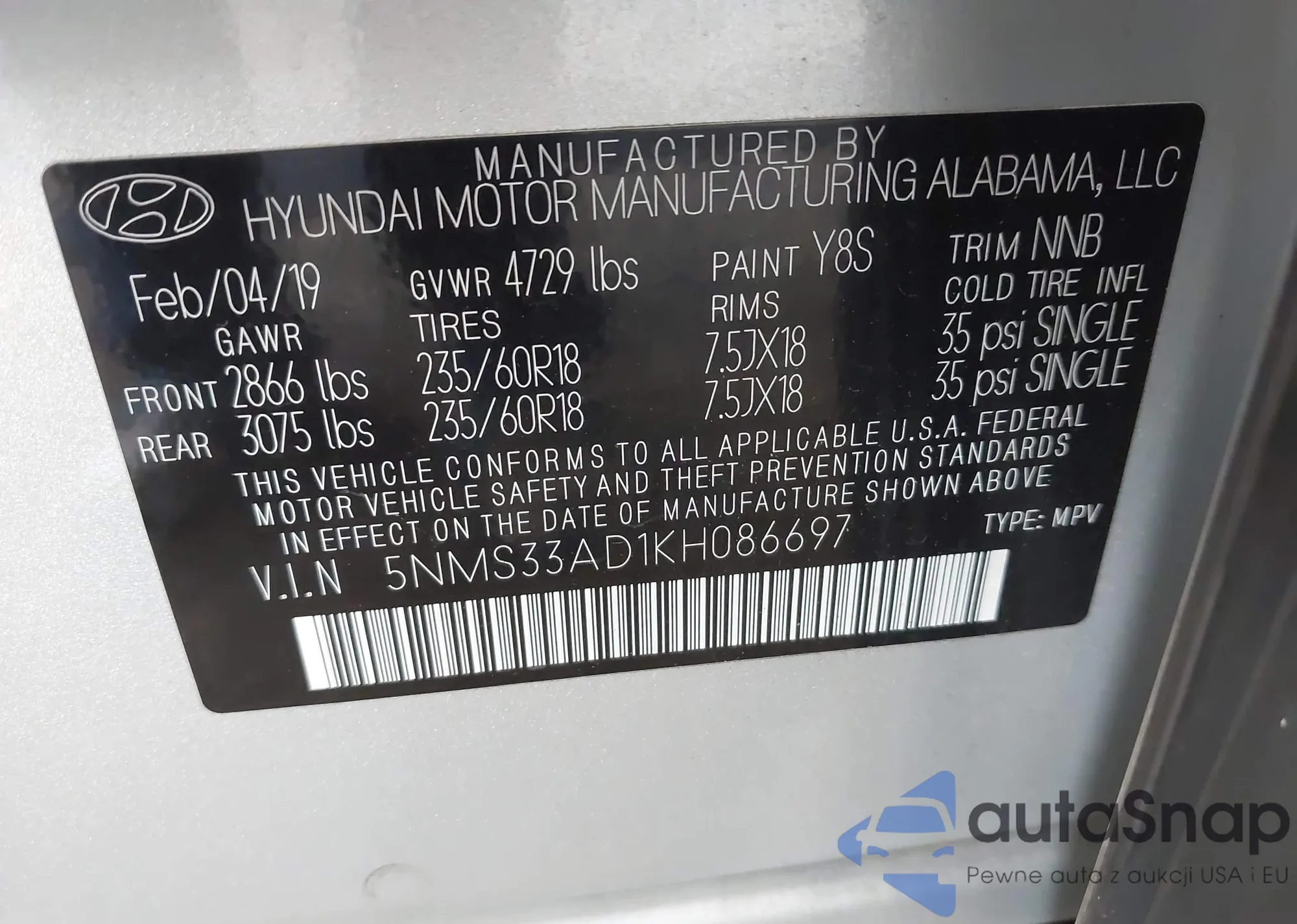 VIN: 5NMS33AD1KH086697