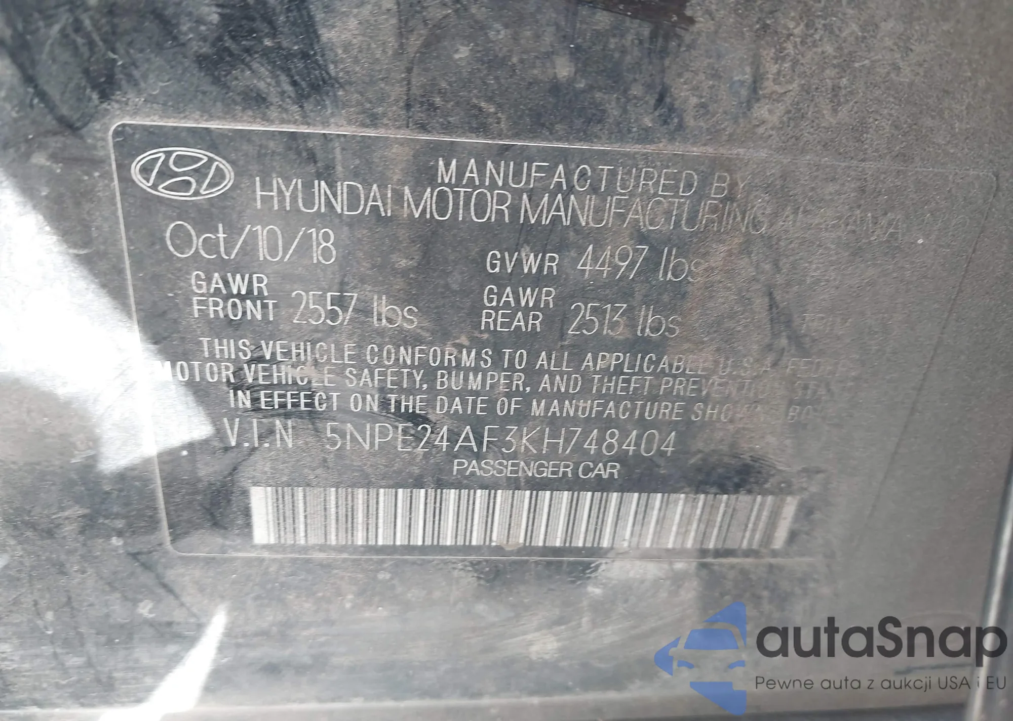 VIN: 5NPE24AF3KH748404