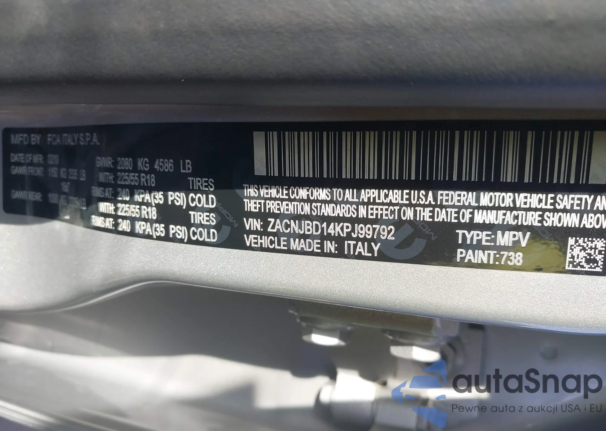 Автомобиль Jeep Renegade 2019 (VIN ZACNJBD14KPJ99792) имеет документы, препятствующие регистрации. Могут возникнуть сложности при экспорте и регистрации. Обратитесь к экспертам AutaSnap для поиска альтернатив.