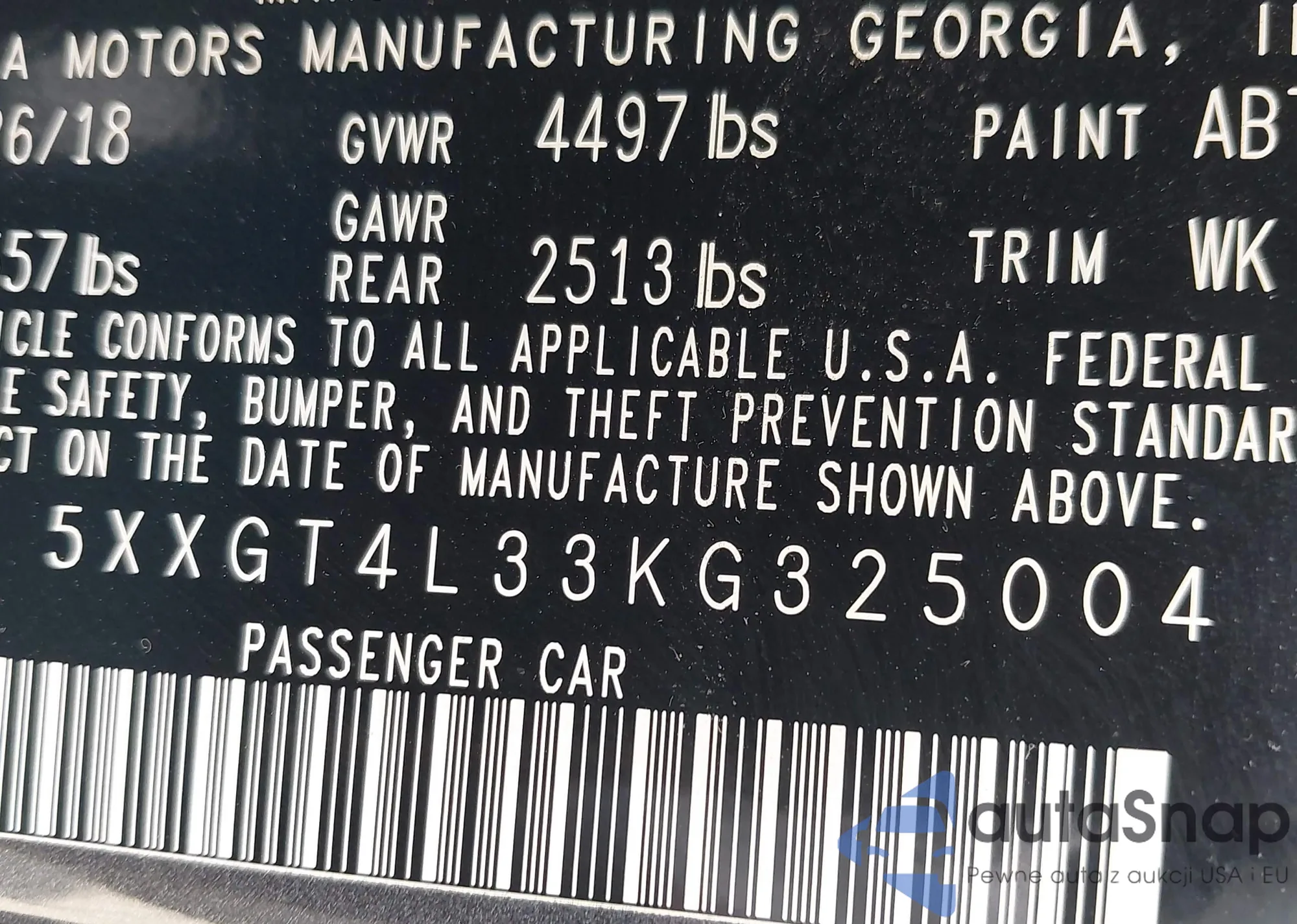 VIN: 5XXGT4L33KG325004
