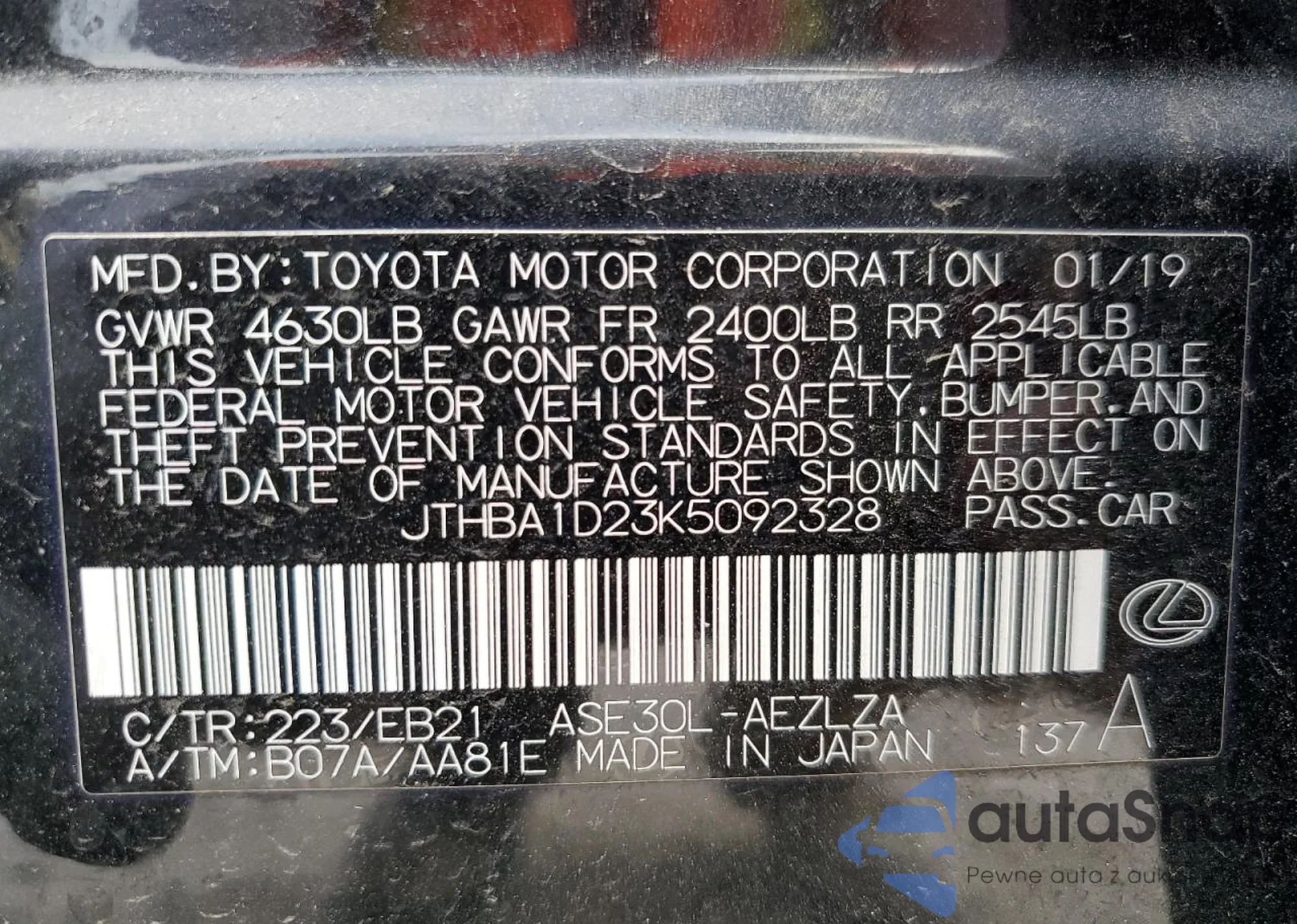 VIN: JTHBA1D23K5092328