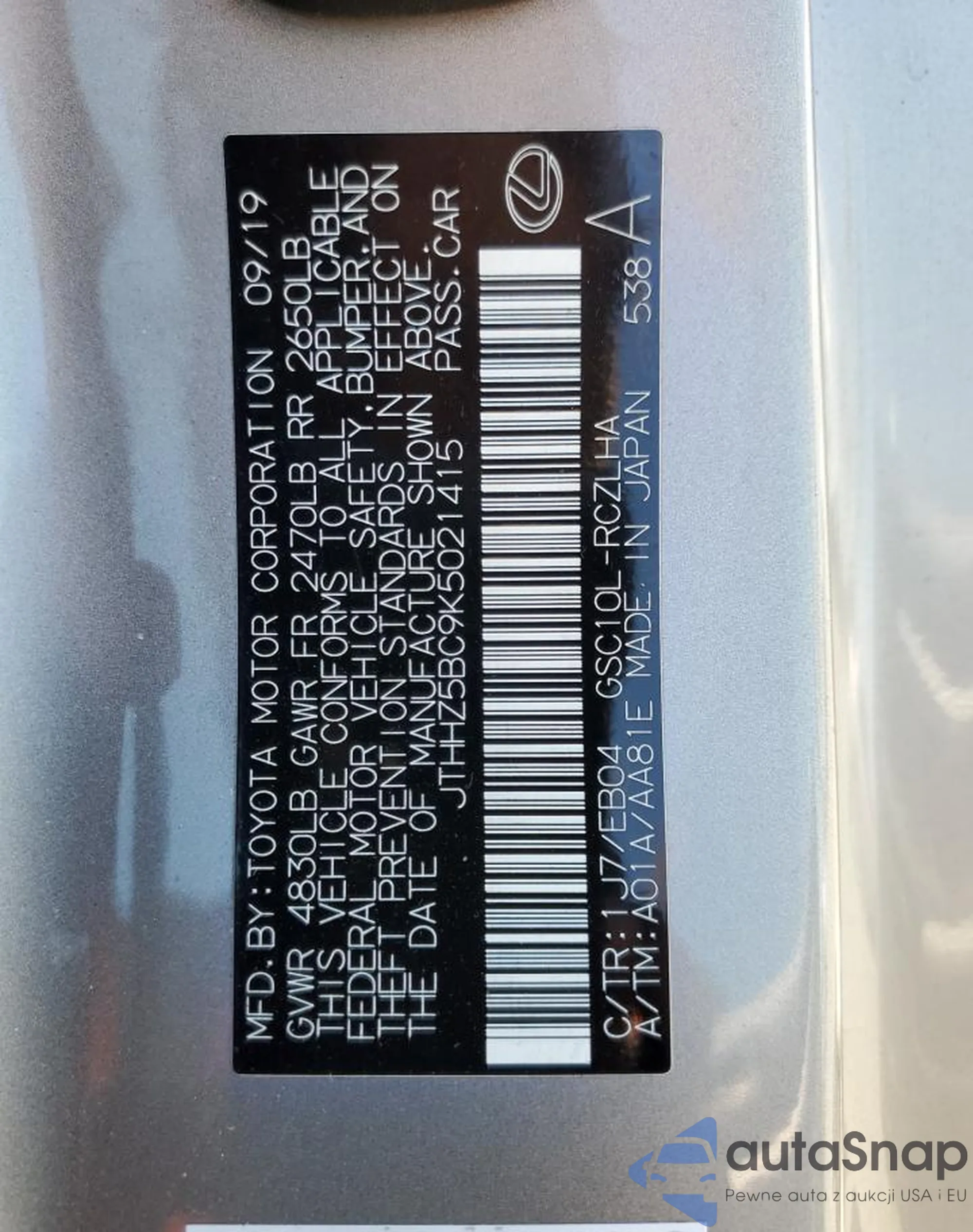 VIN: JTHHZ5BC9K5021415