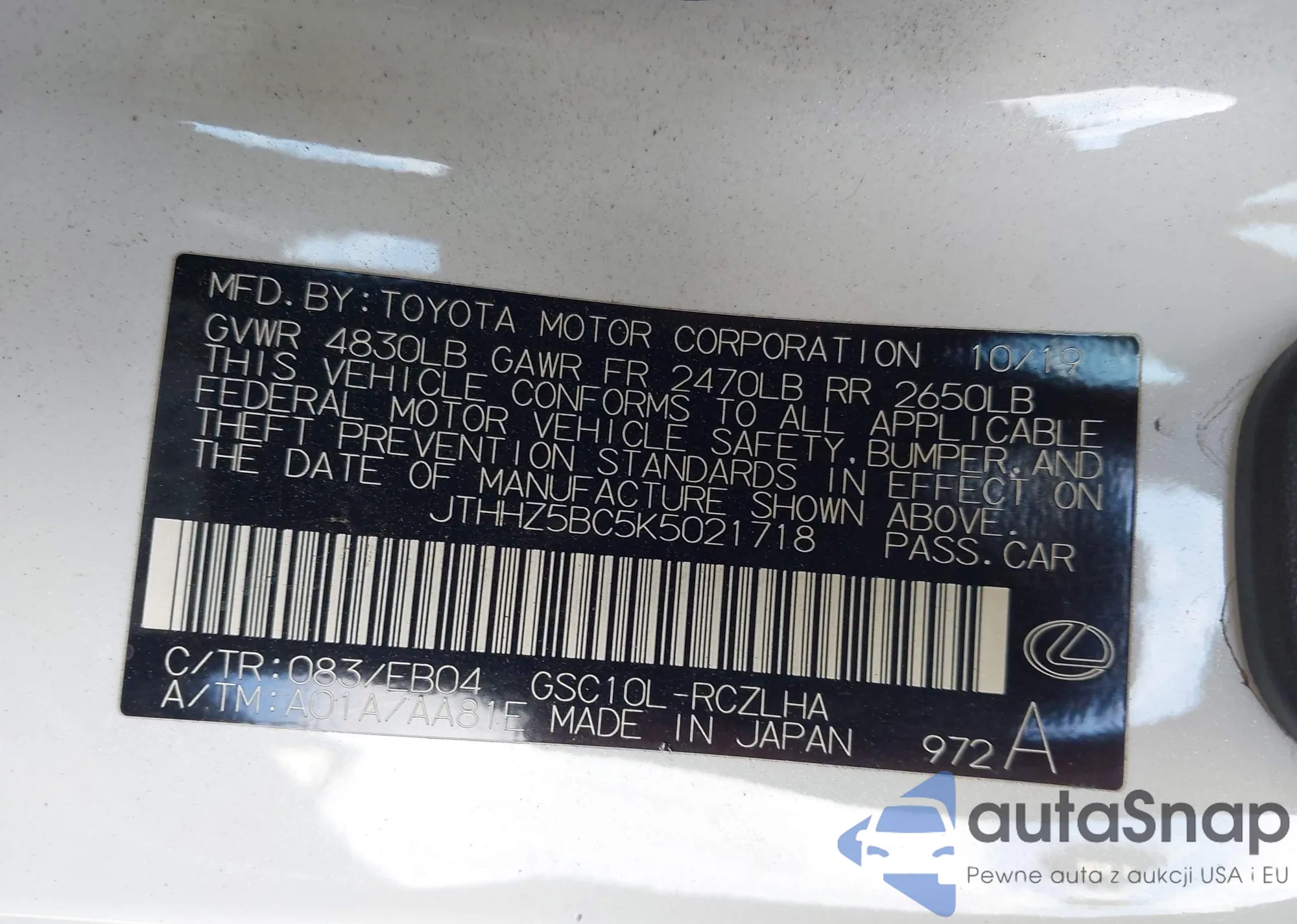 Автомобиль Lexus RC 2019 (VIN JTHHZ5BC5K5021718) имеет документы, препятствующие регистрации. Могут возникнуть сложности при экспорте и регистрации. Обратитесь к экспертам AutaSnap для поиска альтернатив.