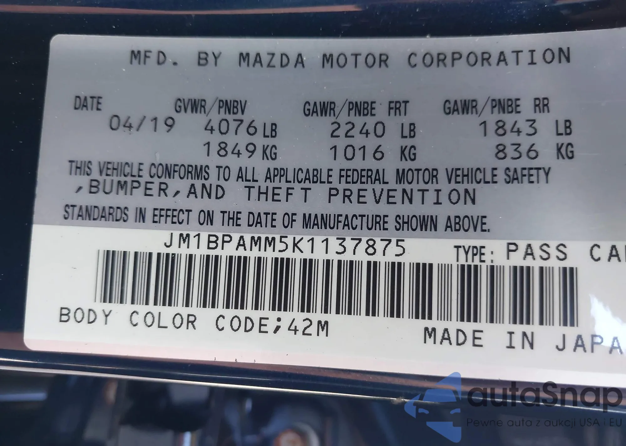 VIN: JM1BPAMM5K1137875