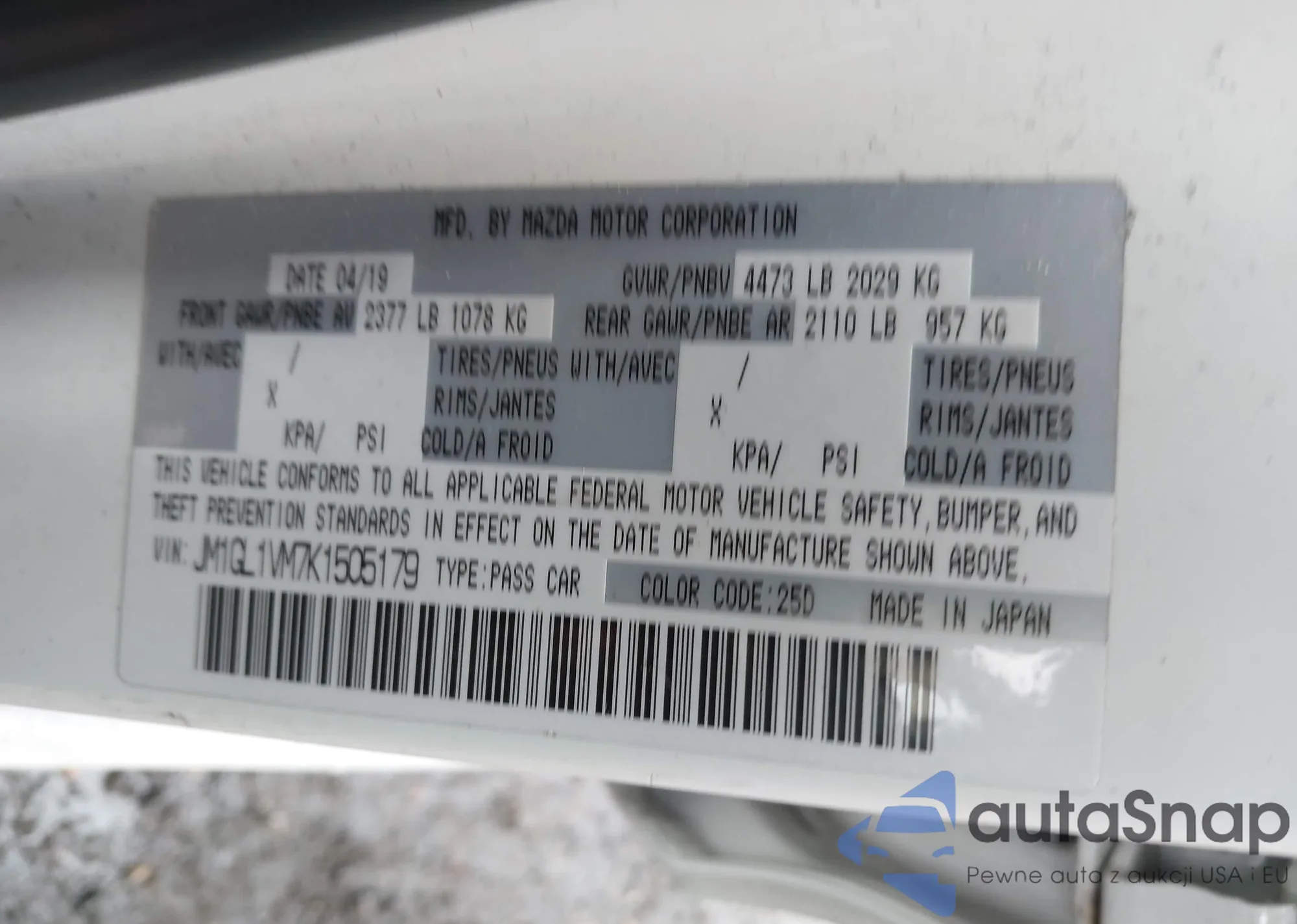 VIN: JM1GL1VM7K1505179