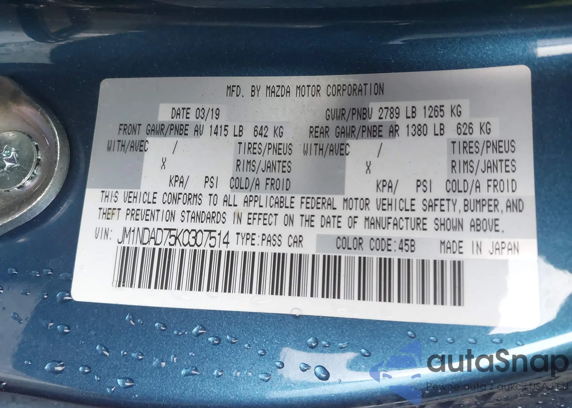 Автомобиль Mazda MX-5 2019 (VIN JM1NDAD75K0307514) ранее не участвовал в торгах. Документы чистые, пробег соответствует или ниже среднего по рынку. Продаётся страховой компанией — рекомендуем покупку. Доставка в порт займет около 6–8 недель.