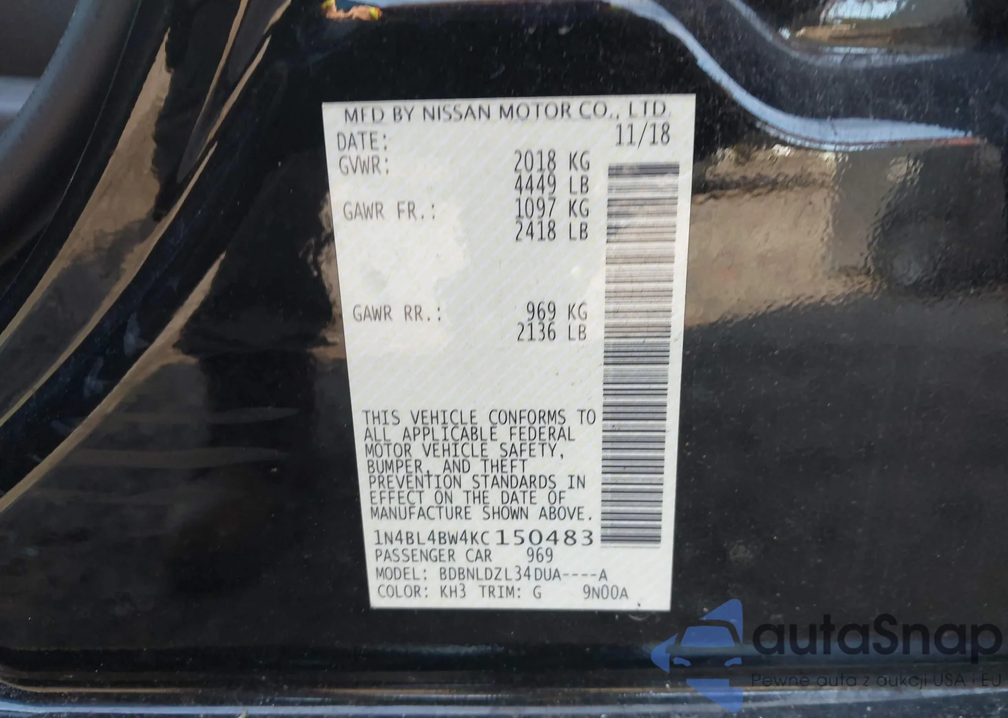 VIN: 1N4BL4BW4KC150483