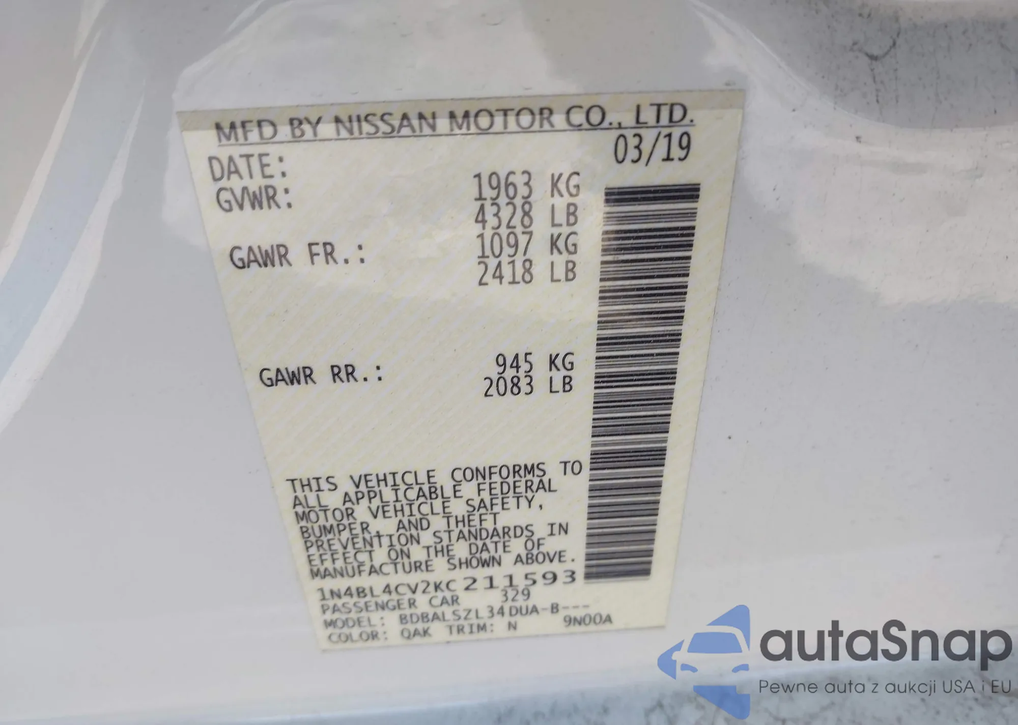 VIN: 1N4BL4CV2KC211593