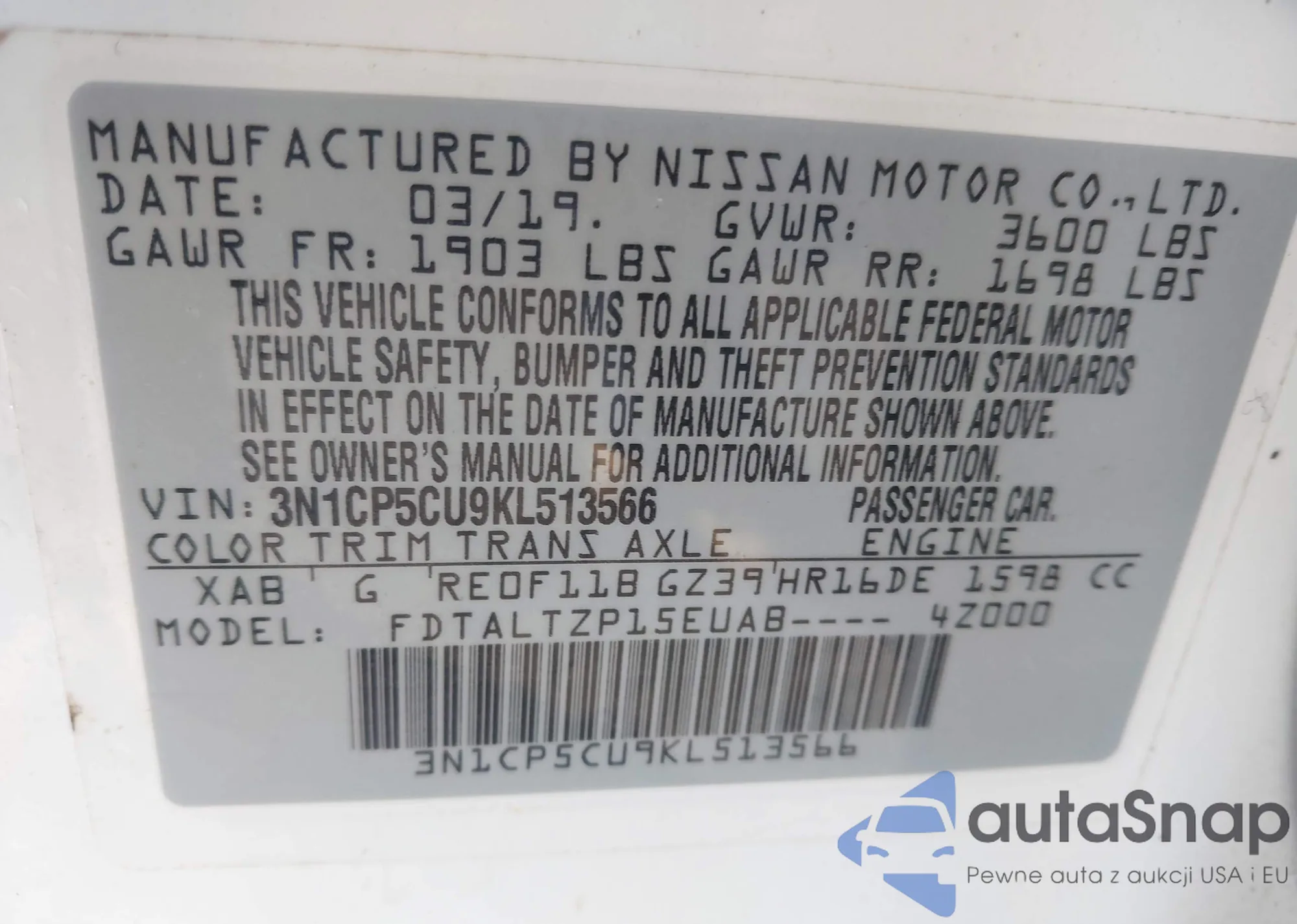 • VIN: 3N1CP5CU9KL513566