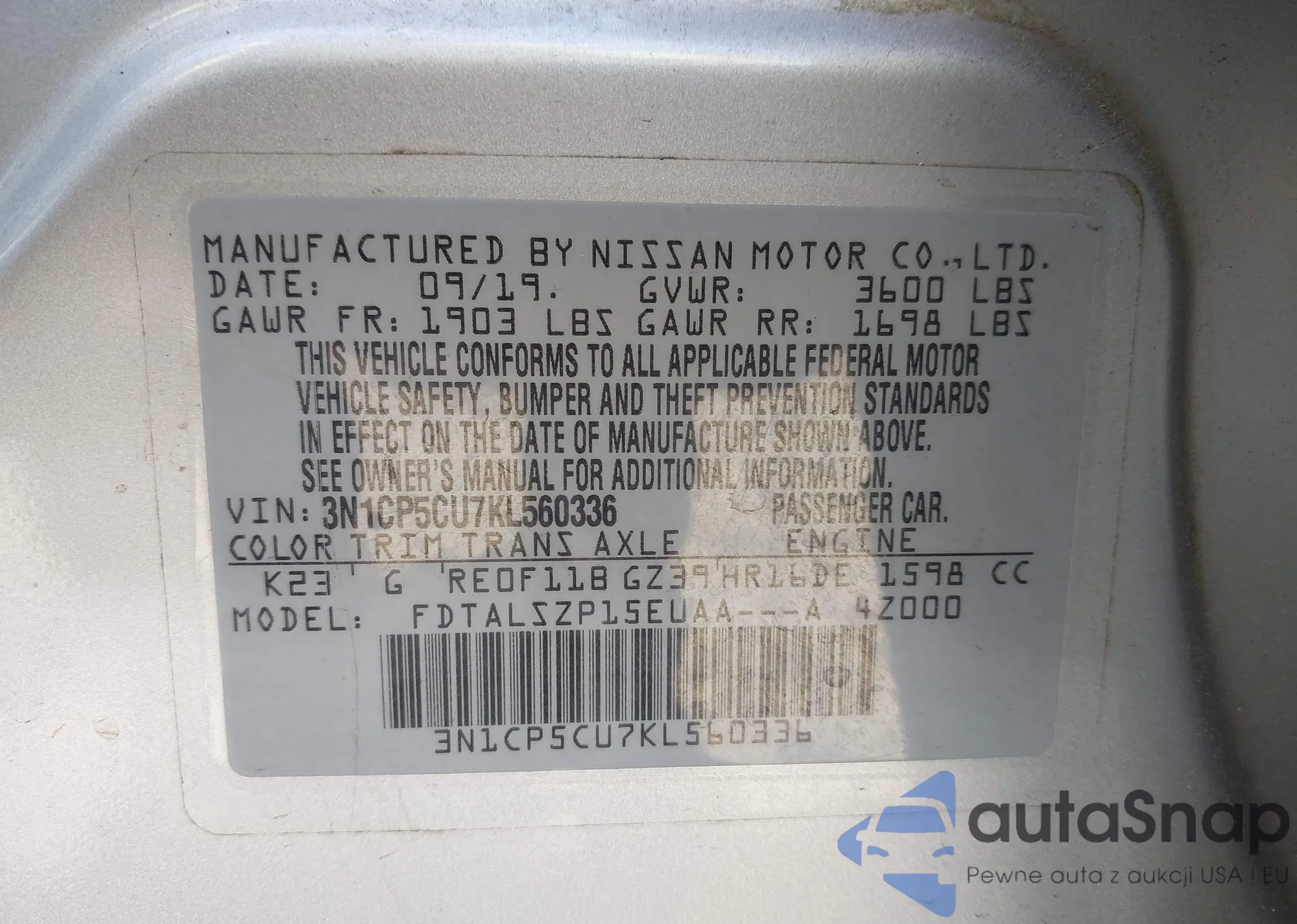 VIN: 3N1CP5CU7KL560336