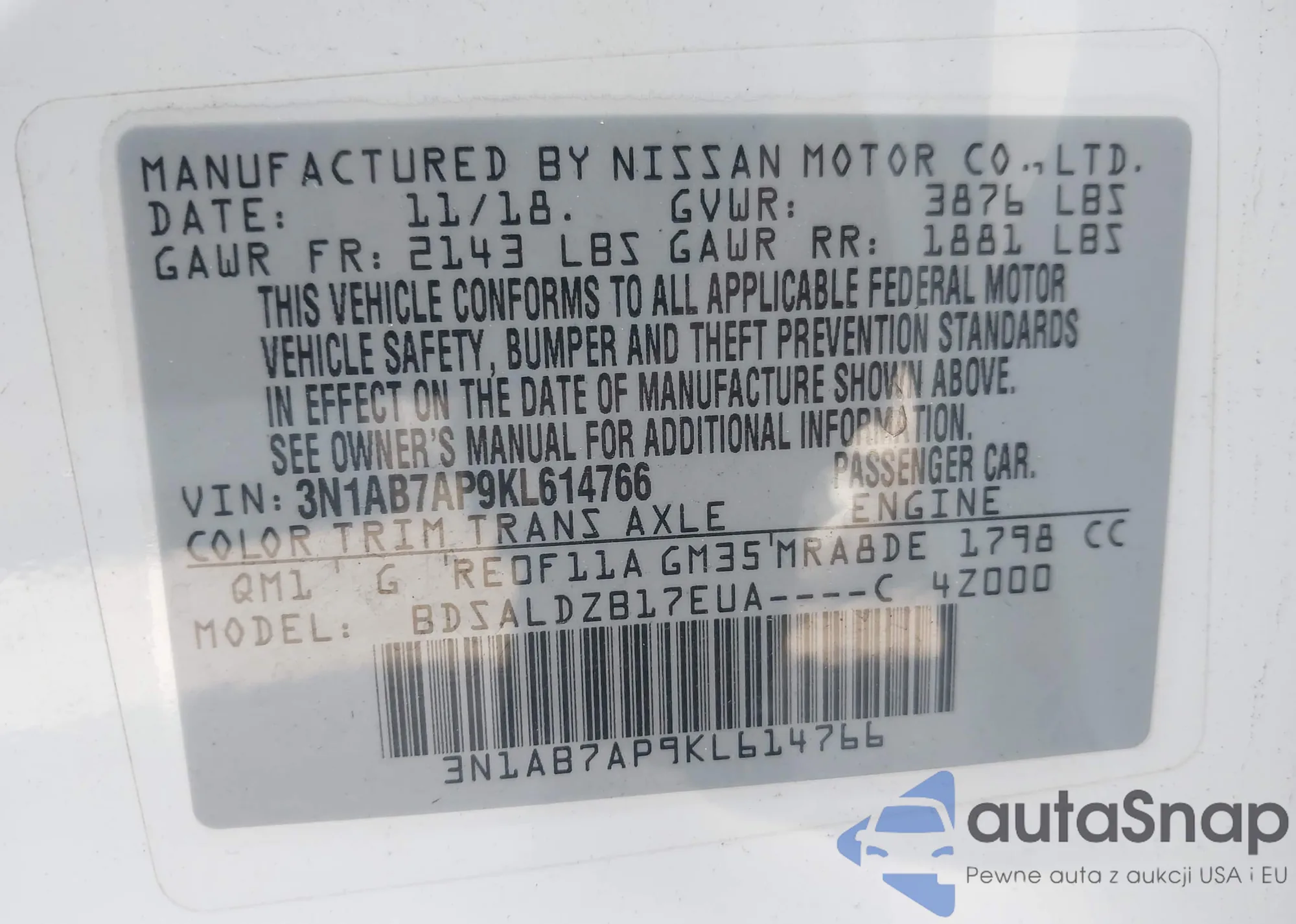 • VIN: 3N1AB7AP9KL614766