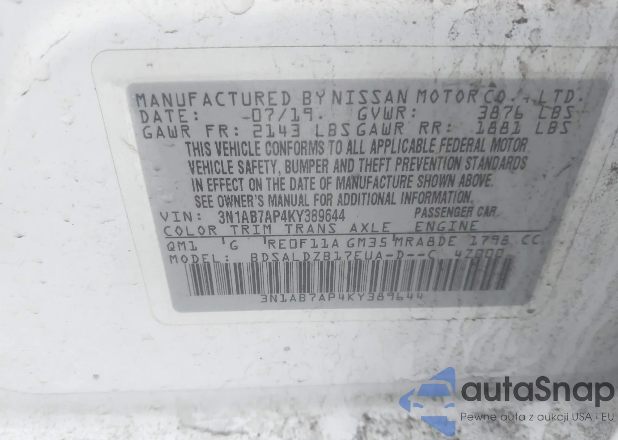 VIN: 3N1AB7AP4KY389644