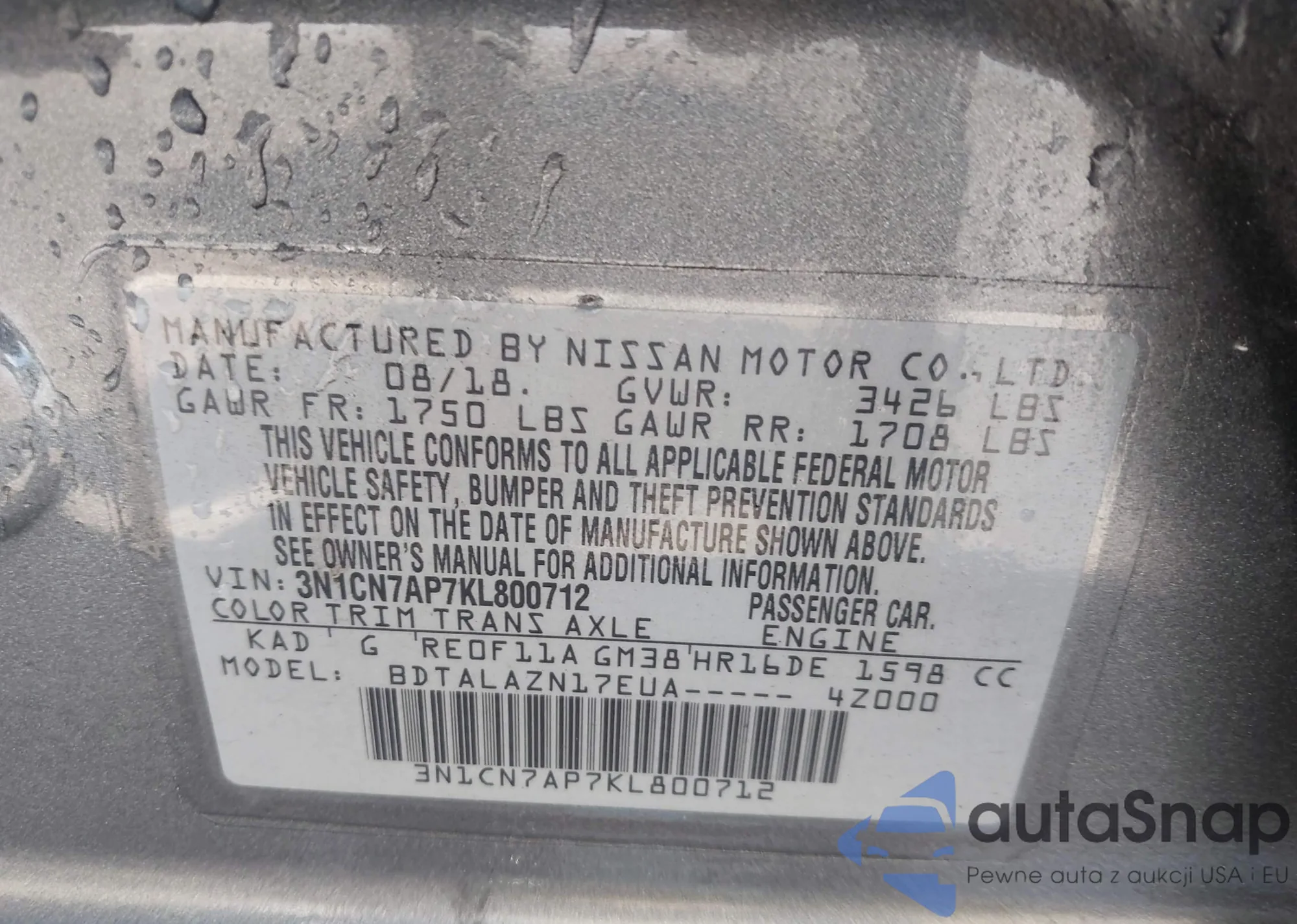 VIN: 3N1CN7AP7KL800712