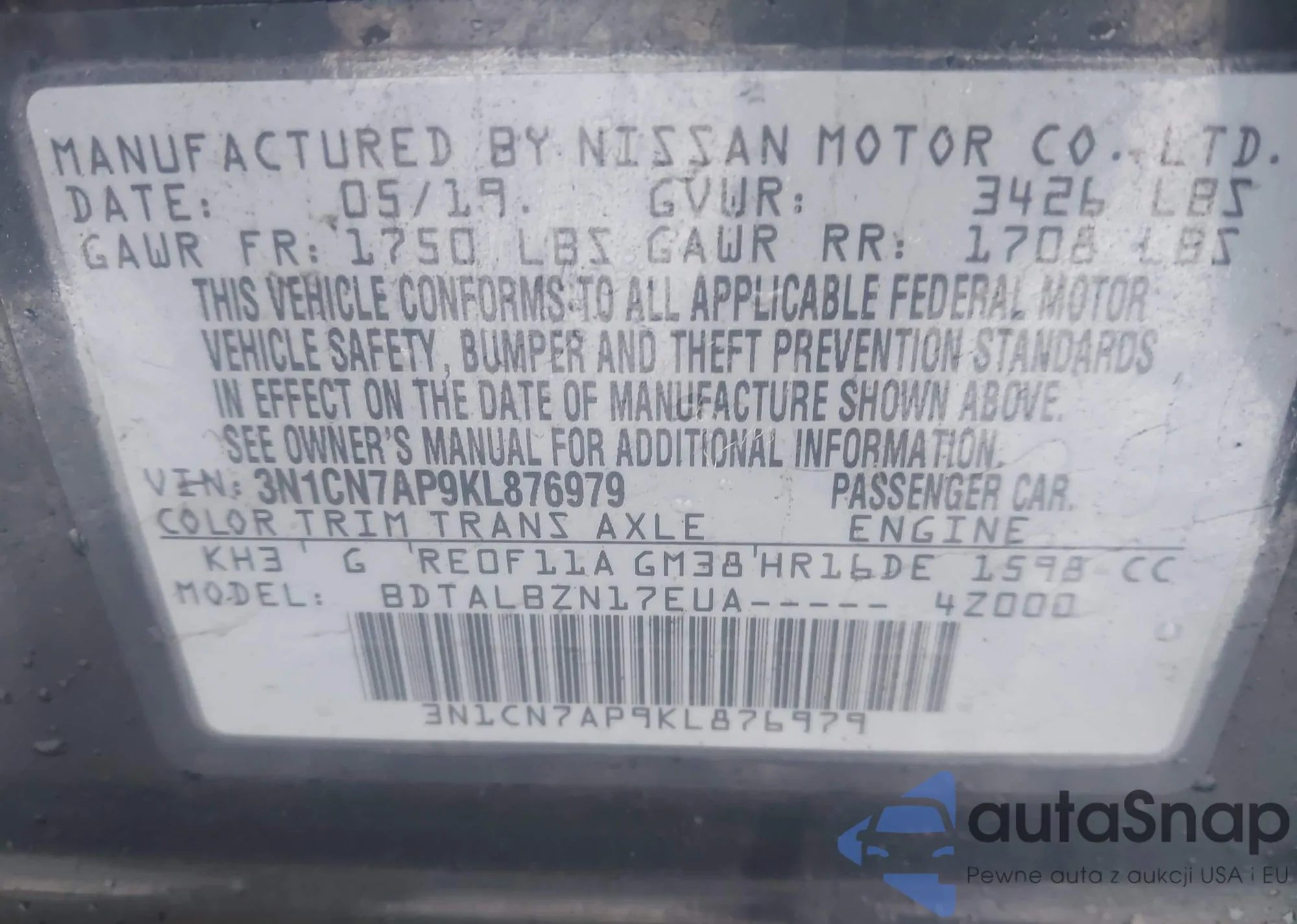 Автомобиль Nissan Versa 2019 (VIN 3N1CN7AP9KL876979) ранее не участвовал в торгах. Документы чистые, пробег соответствует или ниже среднего по рынку. Продаётся страховой компанией — рекомендуем покупку. Доставка в порт займет около 6–8 недель.