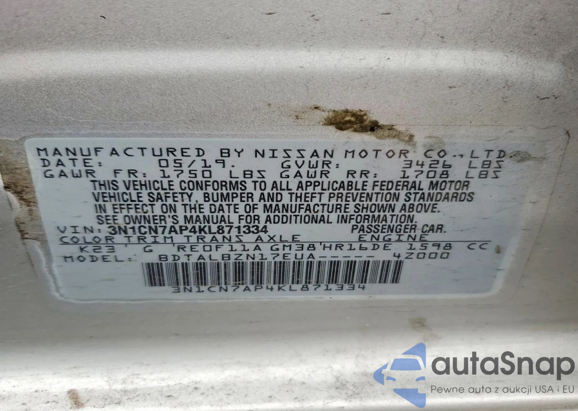Автомобиль Nissan Versa 2019 (VIN 3N1CN7AP4KL871334) ранее не участвовал в торгах. Документы чистые, пробег соответствует или ниже среднего по рынку. Продаётся страховой компанией — рекомендуем покупку. Доставка в порт займет около 6–8 недель.