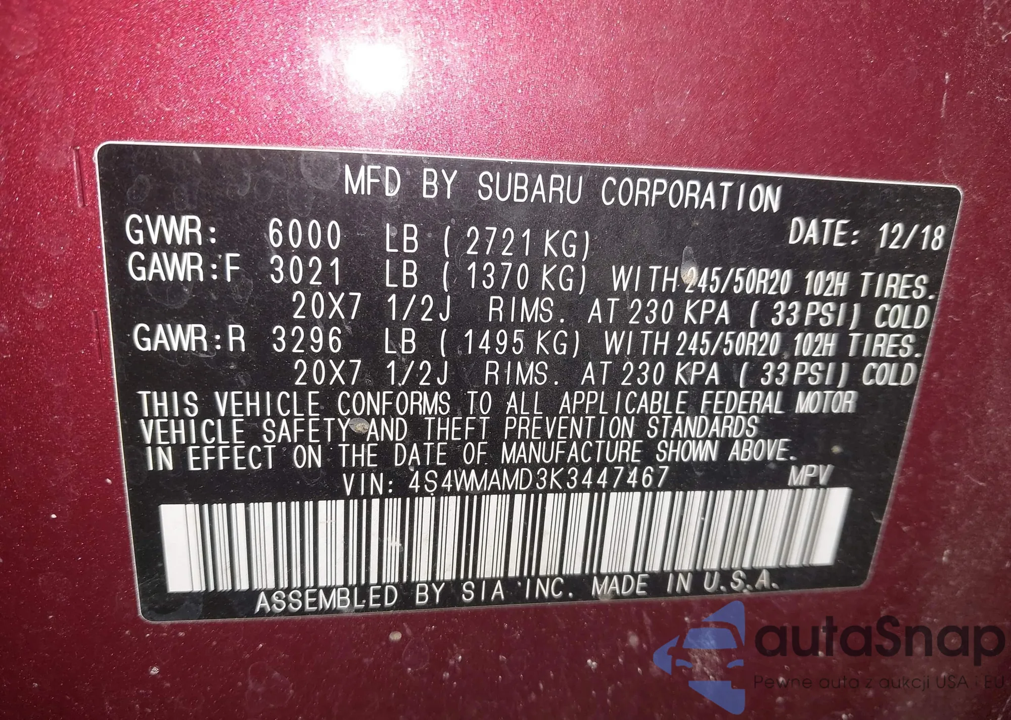 Автомобиль Subaru Ascent 2019 (VIN 4S4WMAMD3K3447467) ранее не участвовал в торгах. Документы чистые, пробег соответствует или ниже среднего по рынку. Продаётся страховой компанией — рекомендуем покупку. Доставка в порт займет около 6–8 недель.