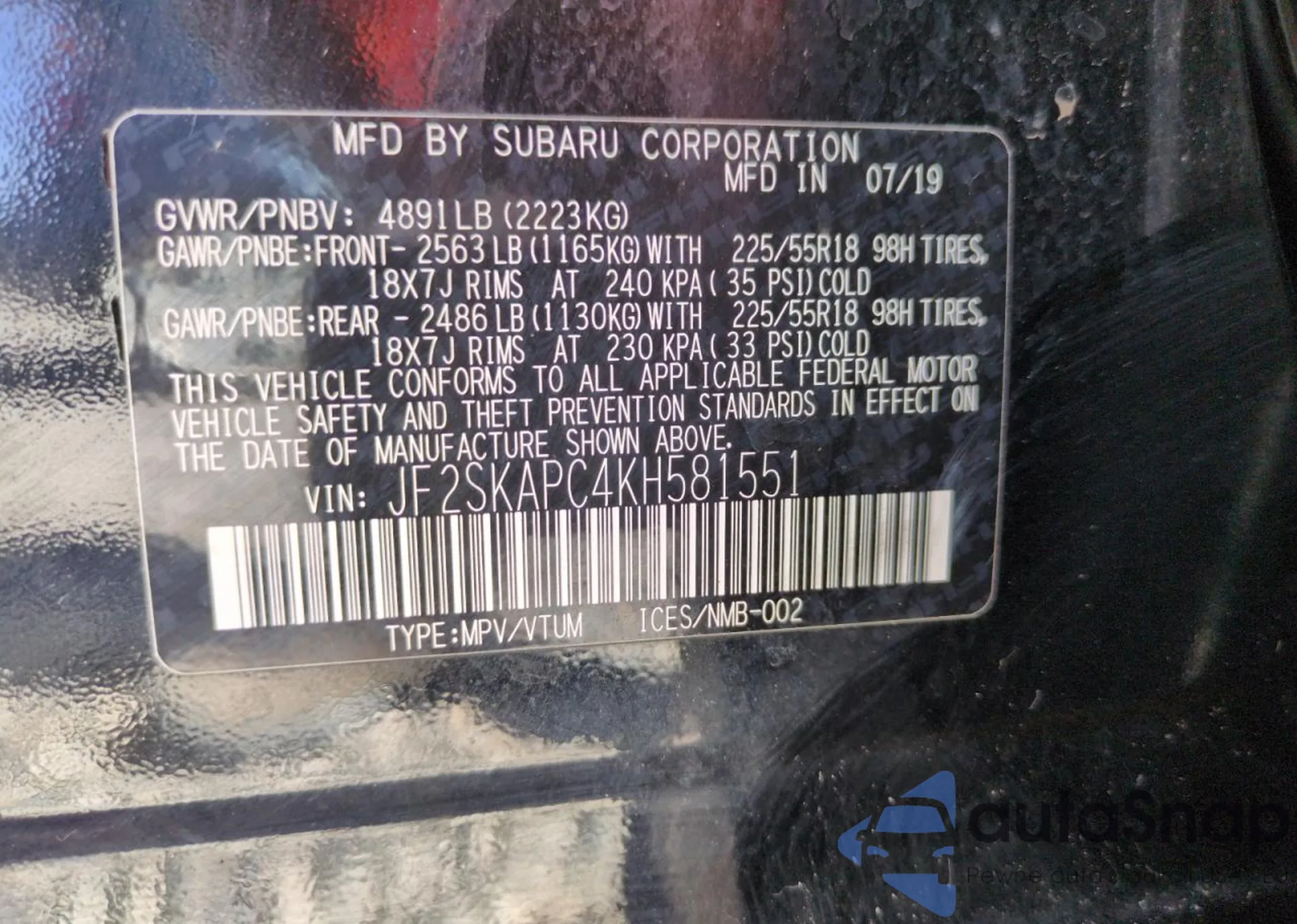 VIN: JF2SKAPC4KH581551