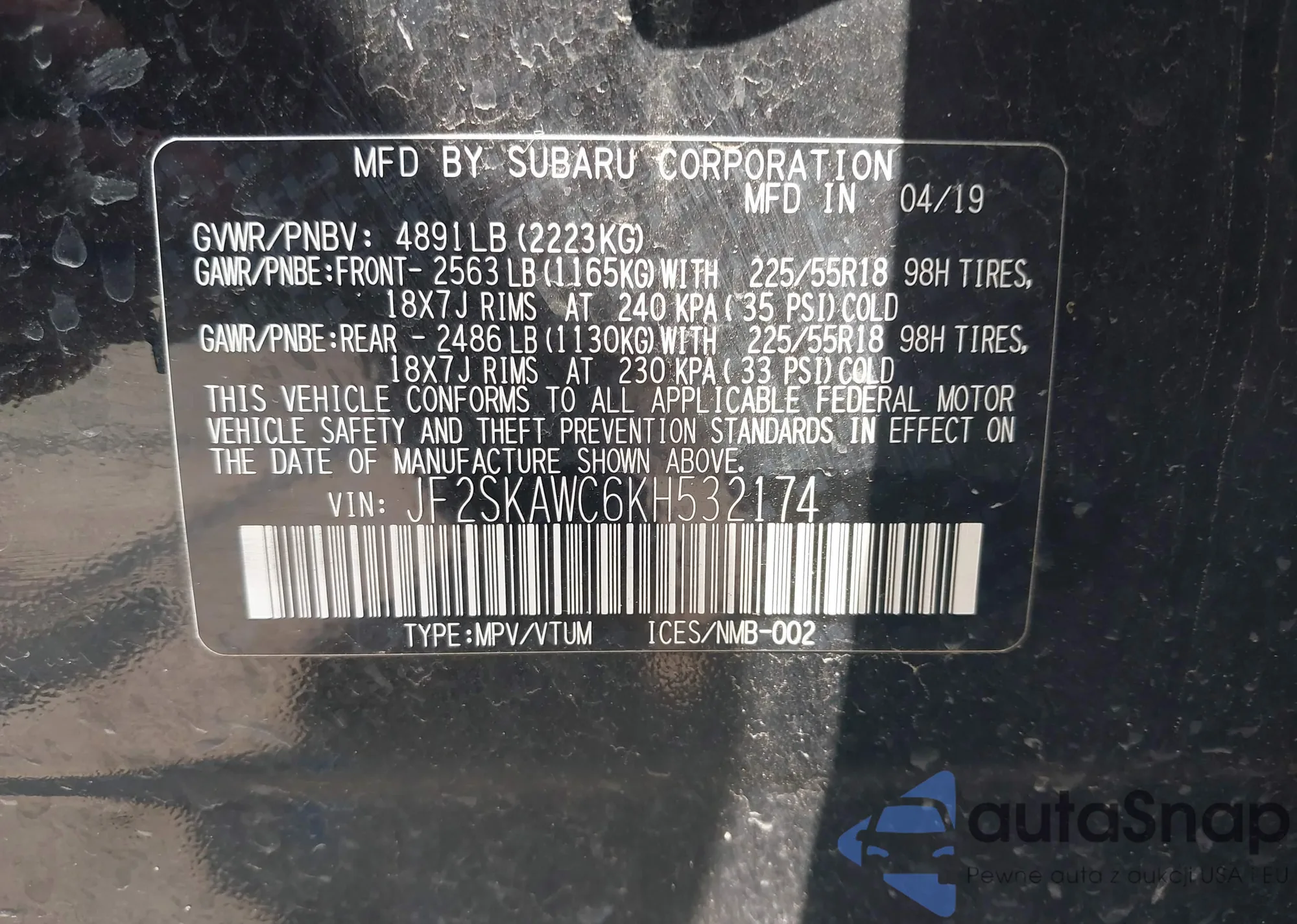 VIN: JF2SKAWC6KH532174