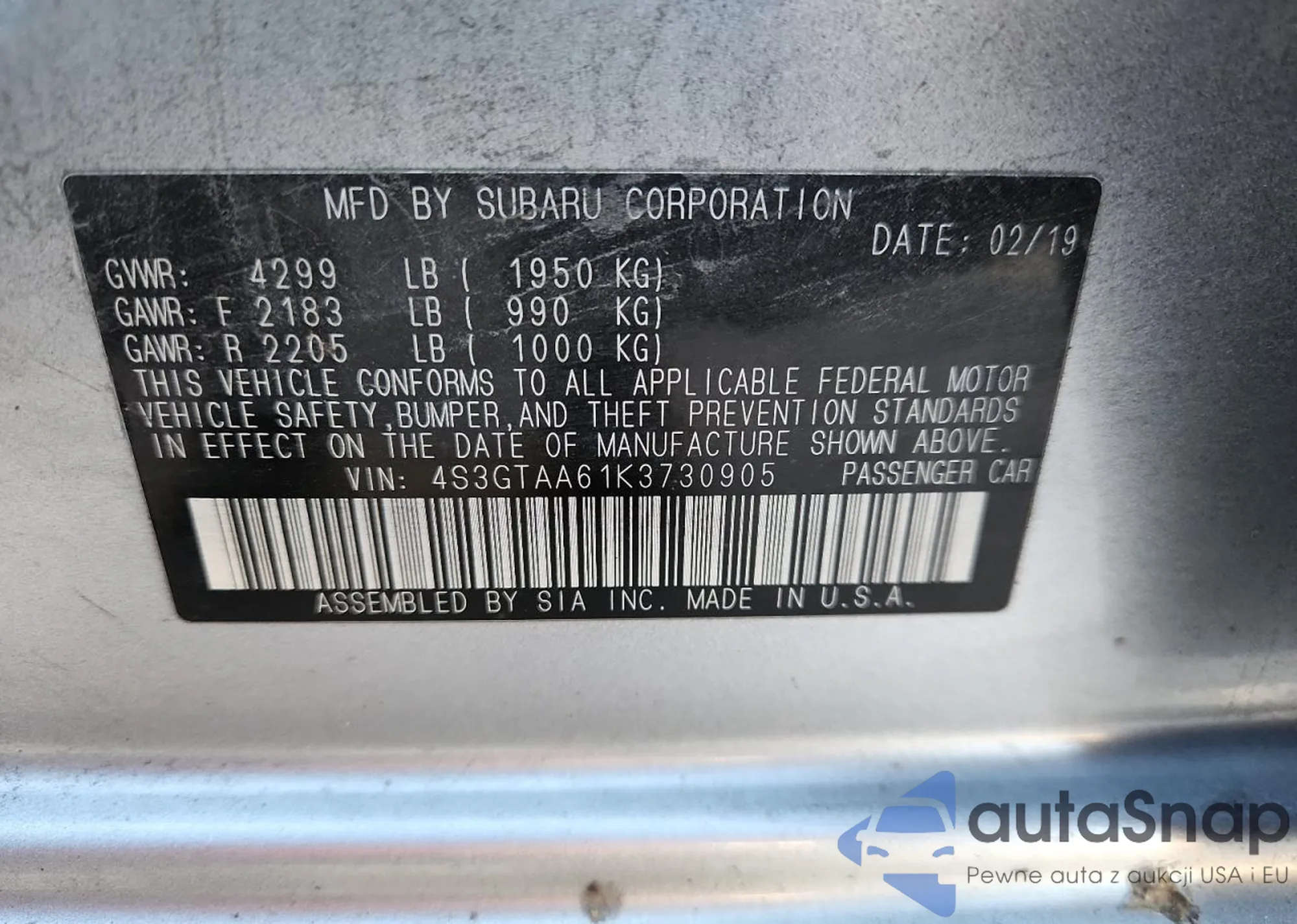 Автомобиль Subaru Impreza 2019 (VIN 4S3GTAA61K3730905) имеет документы, препятствующие регистрации. Могут возникнуть сложности при экспорте и регистрации. Обратитесь к экспертам AutaSnap для поиска альтернатив.