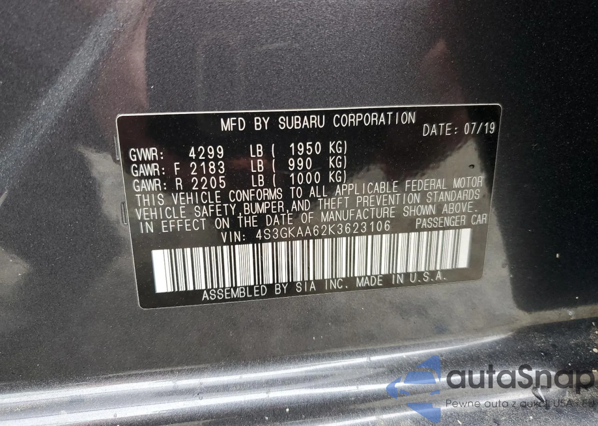 Автомобиль Subaru Impreza 2019 (VIN 4S3GKAA62K3623106) имеет документы, препятствующие регистрации. Могут возникнуть сложности при экспорте и регистрации. Обратитесь к экспертам AutaSnap для поиска альтернатив.