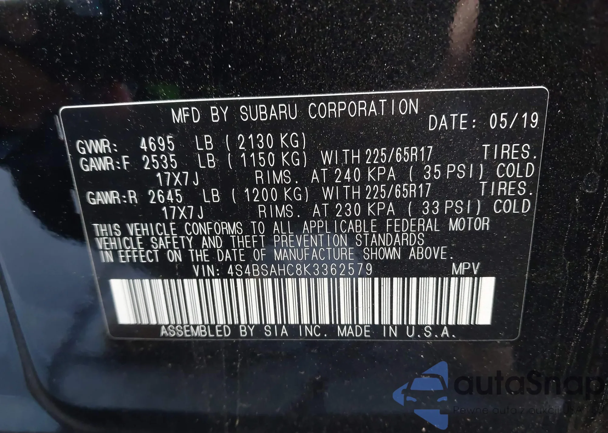 VIN: 4S4BSAHC8K3362579