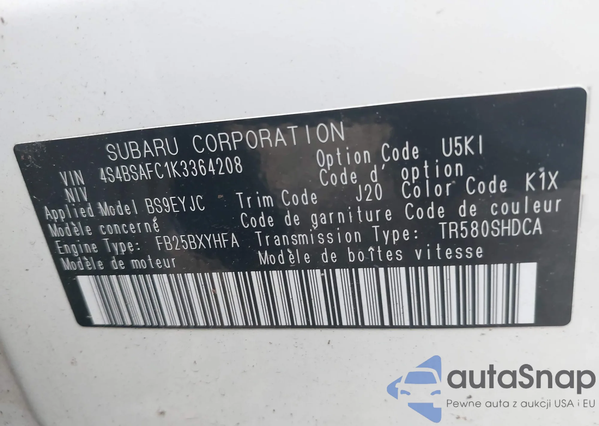 VIN: 4S4BSAFC1K3364208