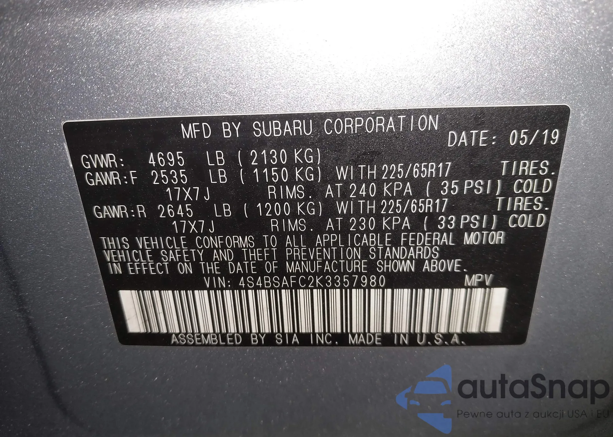 VIN: 4S4BSAFC2K3357980