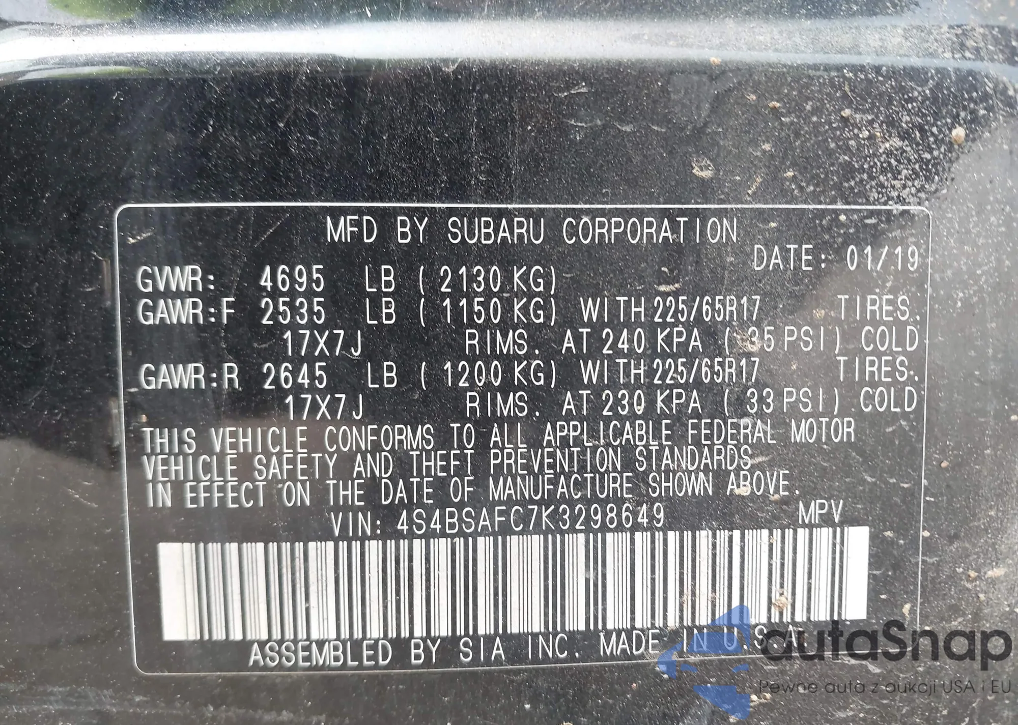 VIN: 4S4BSAFC7K3298649