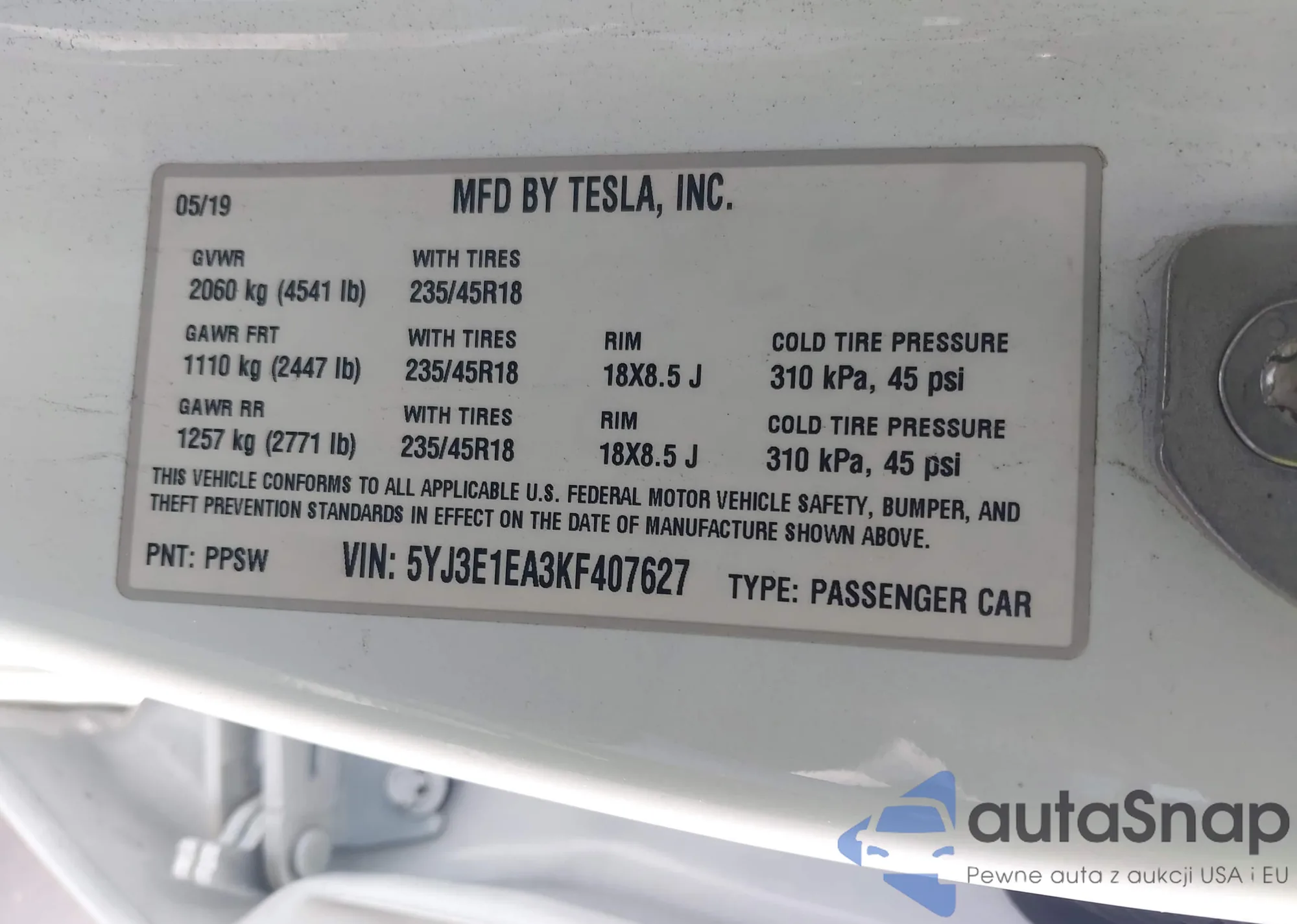 Автомобиль Tesla Model 3 2019 (VIN 5YJ3E1EA3KF407627) ранее не участвовал в торгах. Документы чистые, пробег соответствует или ниже среднего по рынку. Продаётся страховой компанией — рекомендуем покупку. Доставка в порт займет около 6–8 недель.