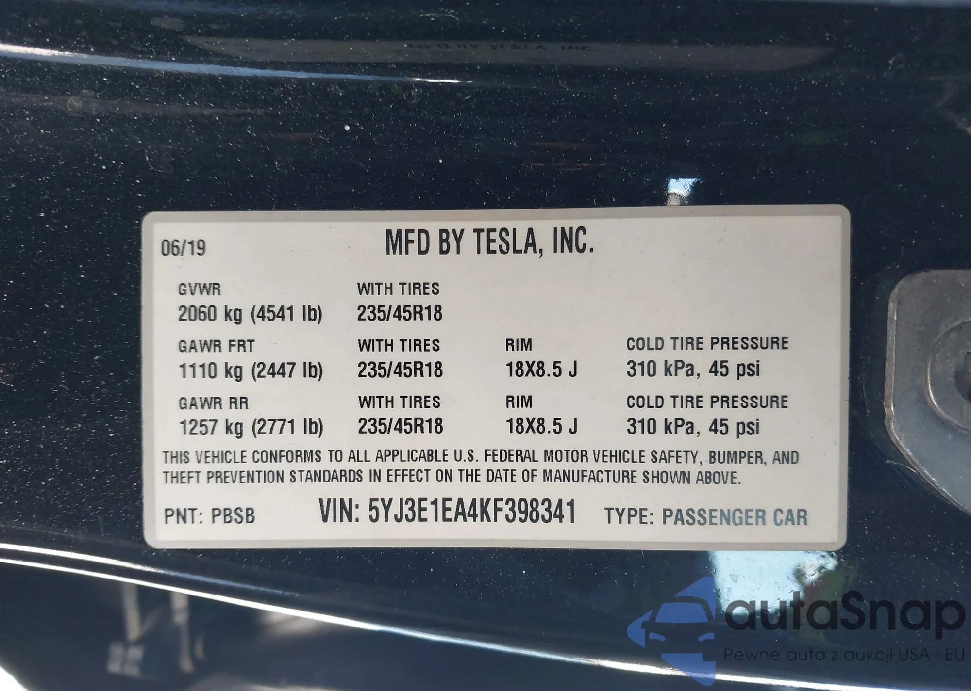 Автомобиль Tesla Model 3 2019 (VIN 5YJ3E1EA4KF398341) ранее не участвовал в торгах. Документы чистые, пробег соответствует или ниже среднего по рынку. Продаётся страховой компанией — рекомендуем покупку. Доставка в порт займет около 6–8 недель.