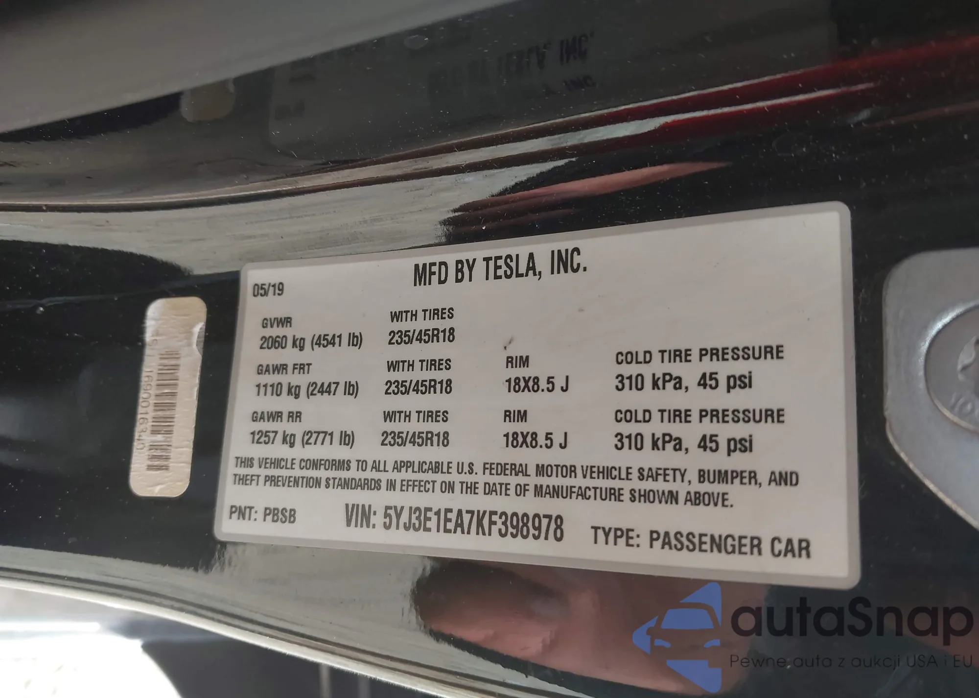 VIN: 5YJ3E1EA7KF398978