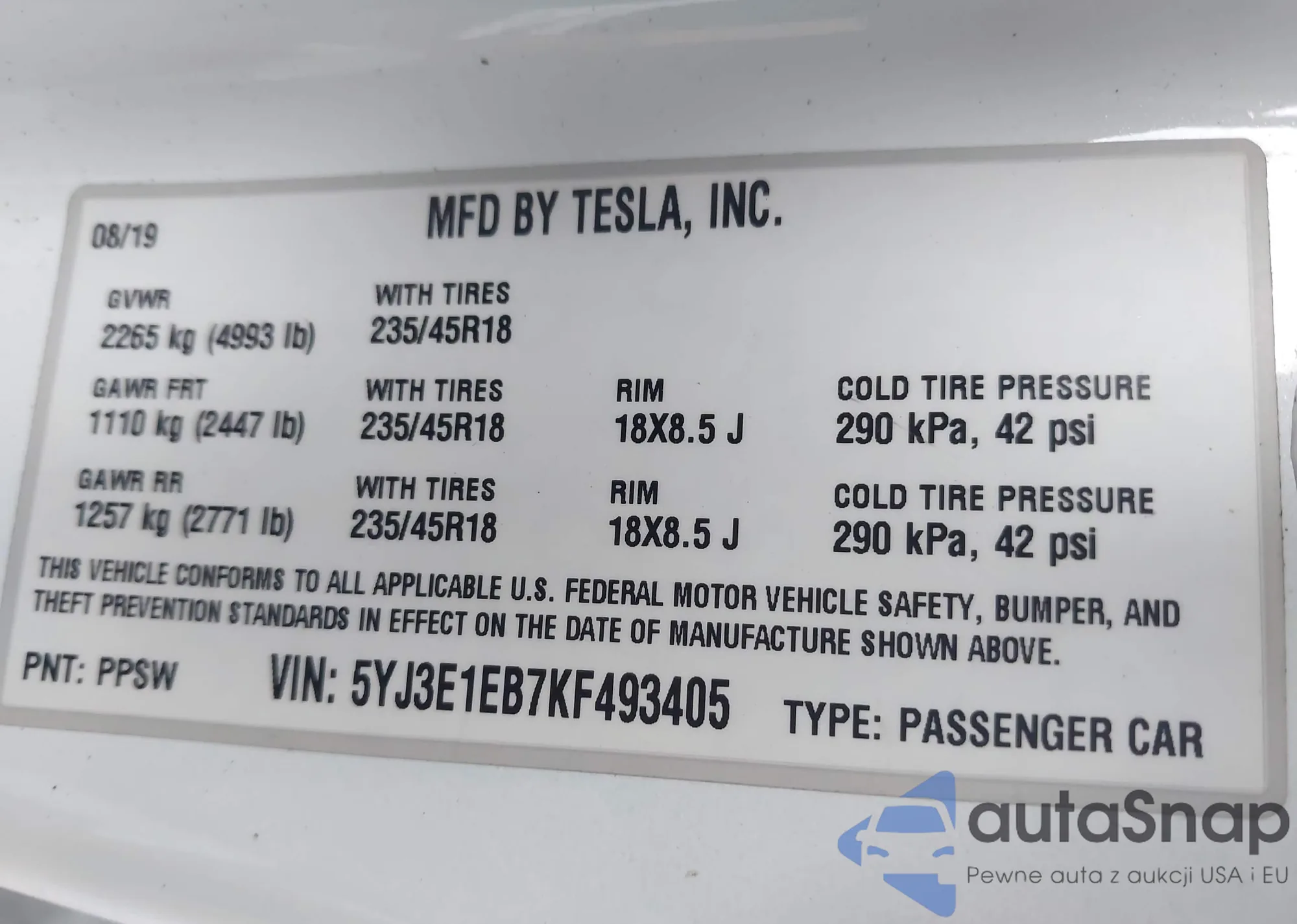 VIN: 5YJ3E1EB7KF493405